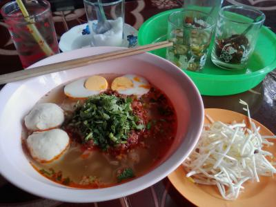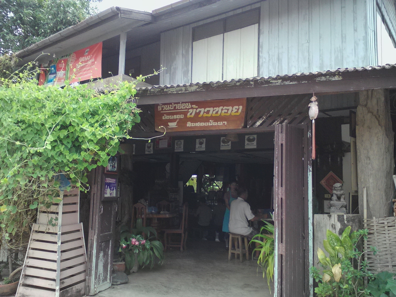 で、カオソーイです。ここのはカリカリ麺の乗った北部タイ風ではなく西双版納(シーサンパンナ︰中国のタイ族自治領)風、ラオス風とも言えます。一番シンプルなトッピングなしなら30Bで食べられます。が、しかしここはせっかくなので贅沢にルークチン(つみれ肉団子)とゆで卵の入ったピセート(特別)を食べてみました。50Bです。特大ルークチンが2つ入っているのでなかなか食べ応えがあります。お味もおいしいです。流行ってる理由がわかります。チェンコンでカオソーイの店は多いですがぜひこの店でも食べてみて下さい。