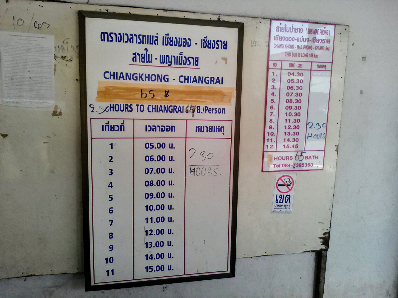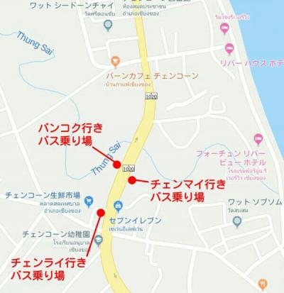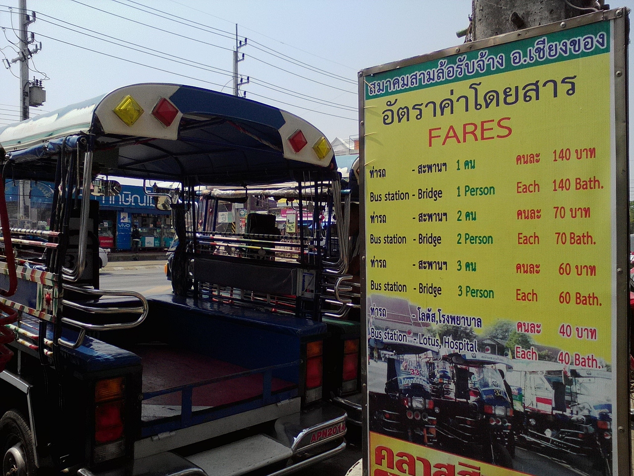 チェンコンの町から第4友好橋であるラオス国境(タイ側のイミグレ)へはソンテウの利用が安いです(1人60B)。車体の横に「BORDERーDOWNTOWN」の表示があります。イミグレから来る場合はちゃんとチケットカウンターもあり、ソンテウが待機しているので乗りやすいですが、チェンコンの町には決まった乗り場がありません。見かけたら合図をして停まってもらうしかありません。これでは使いにくい。