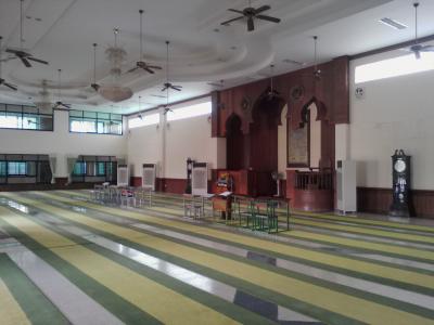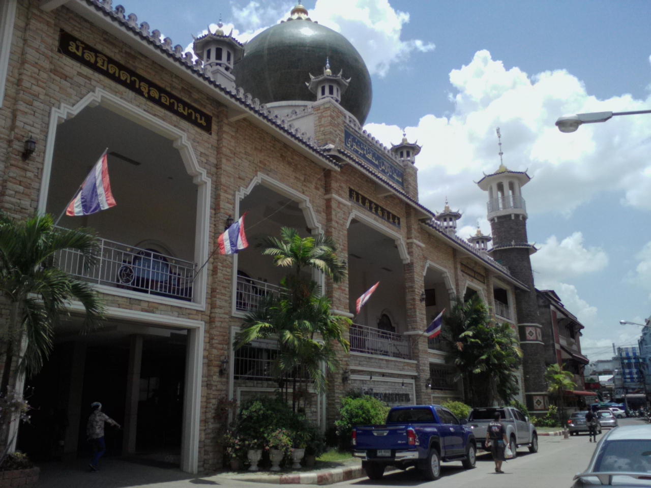 周りの建物とは一線を画す異質さを漂わせています。タイの田舎町にあるモスクとしてはかなり立派で荘厳ささえ感じられました。入口を入ったところにいたモスリムの方に声をかけ、内部(上階)の礼拝室に入る許可をいただきました。上る階段も制約があるようなので注意が必要です。礼拝室は思ったより狭く、特別な雰囲気はあまり感じられませんでした。
