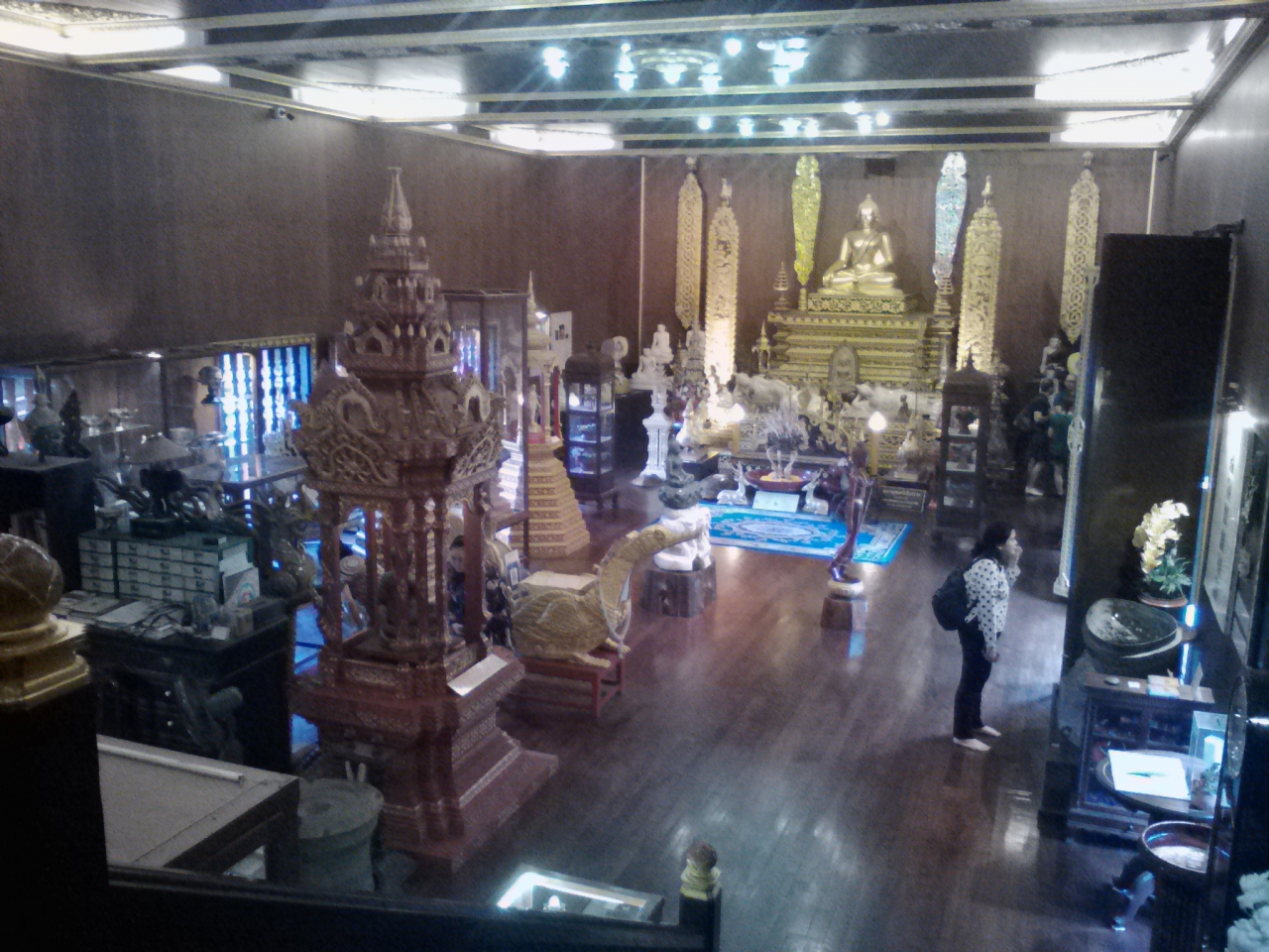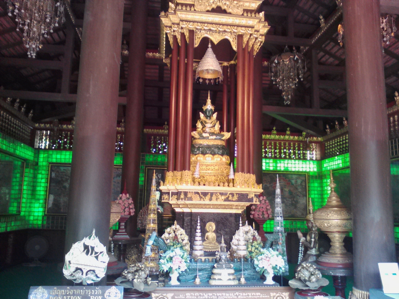 名前のとおり、バンコクにあるワットプラケオと縁のあるお寺です。なんとバンコクのエメラルド仏もかつてこの寺に納められていたようです。見どころのエメラルド仏だけでなくお堂の中もエメラルド色の灯りが施されていてなかなかおしゃれな“演出”がされています。この寺でもう一つ外せないのが博物館。逆にモダンな造りにも見える黒色の重厚なラーンナータイ様式で建てられています。内部には寺院に縁の仏像などが展示されています。