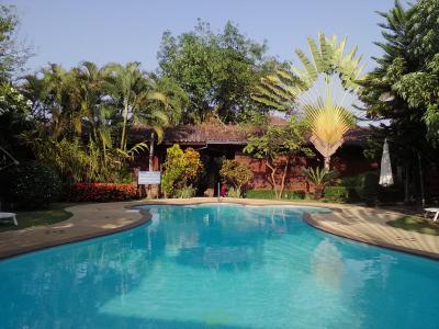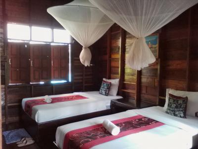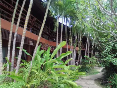 安い部屋は緑豊かな中庭を囲む長屋のバンガロー。とっても静かで落ち着ける部屋ですが安いのにはわけがあります。木造なので隣りの部屋の物音、床のきしみが丸聞こえです。網戸がないので夜は扉、窓を開けておくと蚊や虫かいっぱい入ってきます。蚊帳の中にいれば大丈夫ですが…。