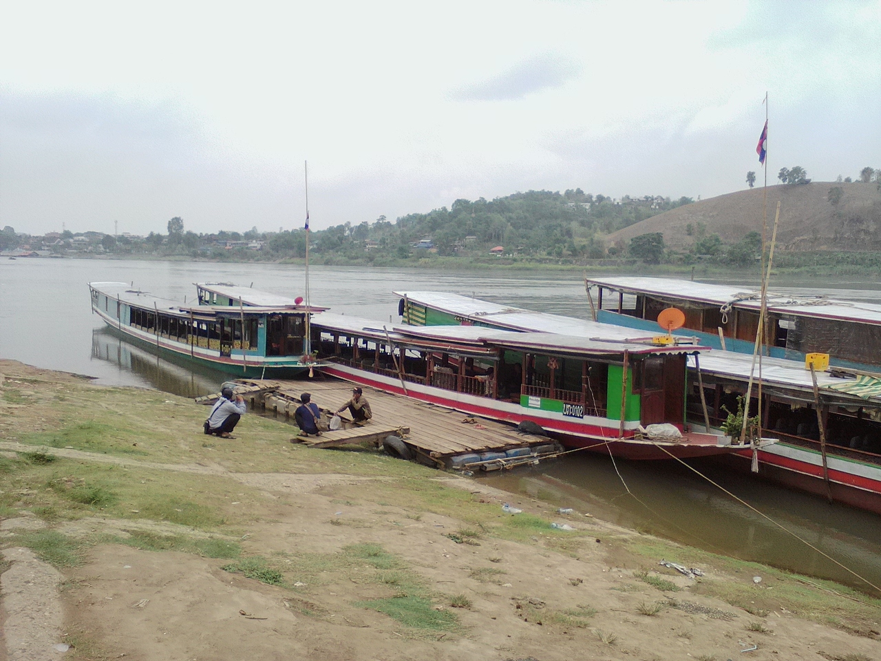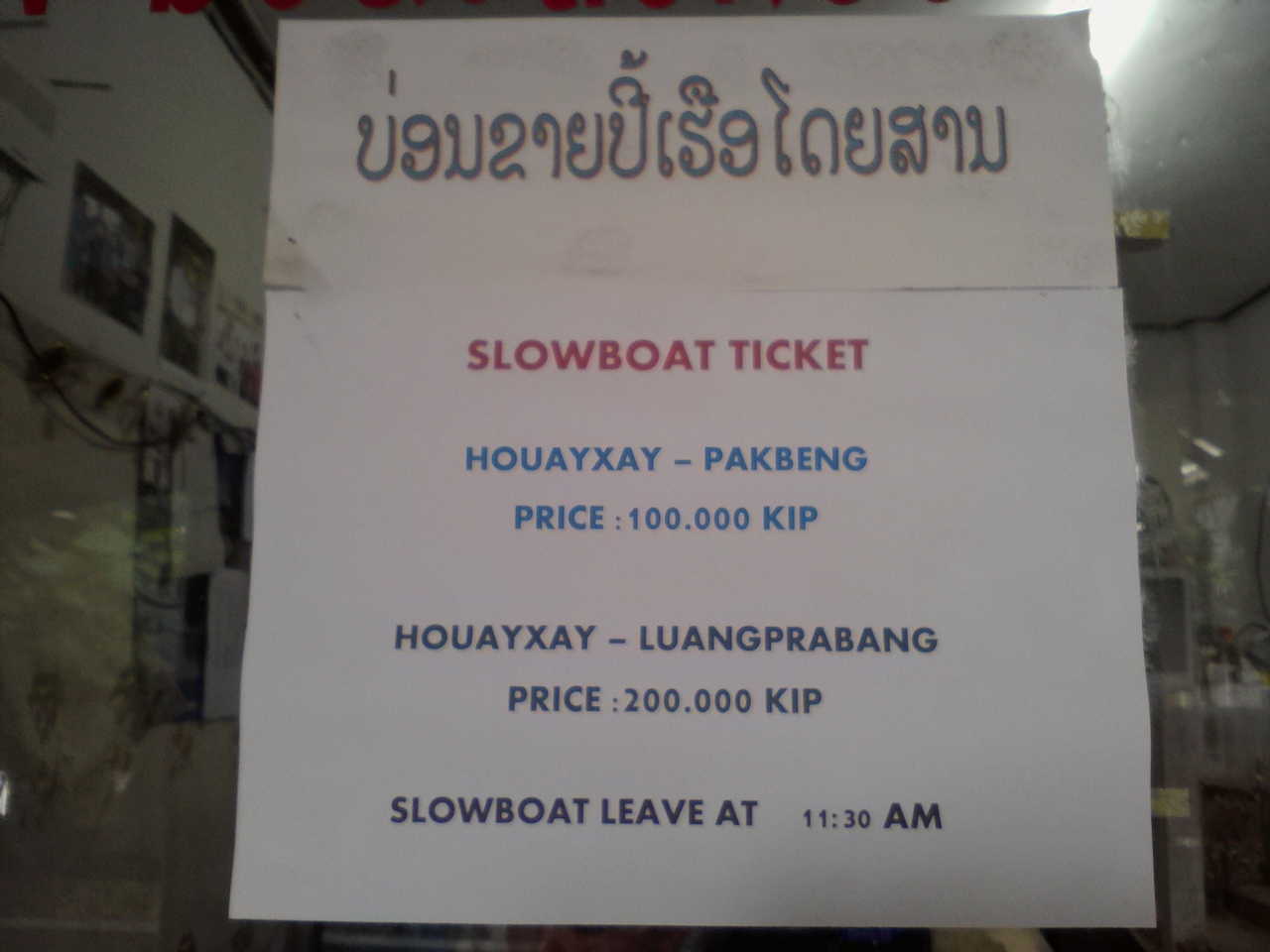 スローボート乗り場は旅行者用のゲストハウスやレストランが集まるエリアからは北に1kmほど離れています。チケットはボート乗り場で買うことができます。ルアンパバーンまでは20万kip、パクベンまでは10万kip。出発時間は11:30(毎日運行)、ルアンパバーンまでは1日では行けないのでパクベンで1泊することになります。パクベン着は17:00頃、G.Hは数多くありますので到着後に容易に探すことができます。翌朝出発し、ルアンパバーンには16:00頃に到着予定です。