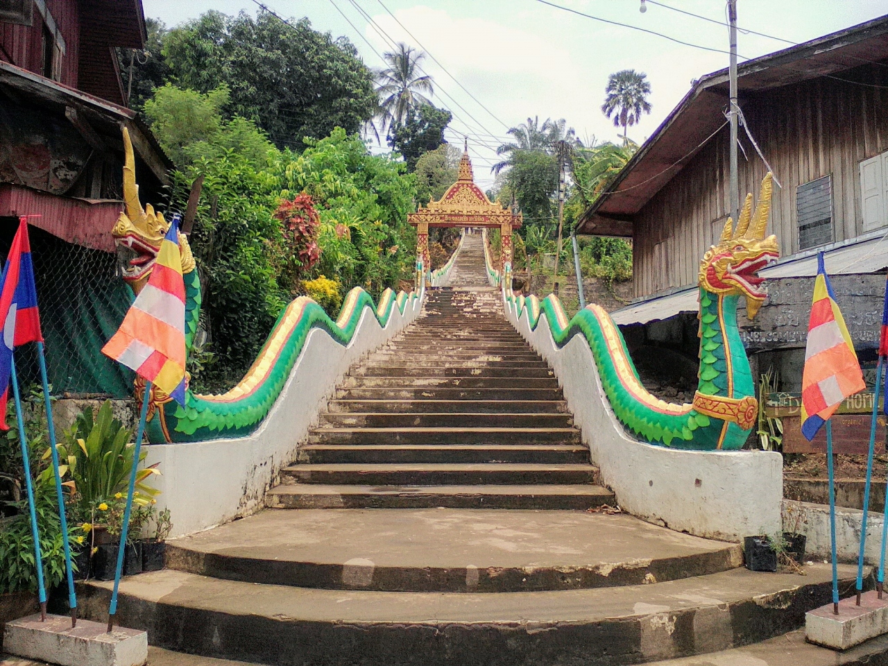 ゲストハウスやレストランが集まるメコン川沿いの通りを歩けば必ず、この“龍がお出迎えしている階段”が目に留まることでしょう。これが「ワット チョムカオ マニーラット」の入口です(他にもありますが…)。ながーい階段を登ればそこは別世界、キンキラのお寺が待っています。ビジュアル的に“映える”ものがいくつもあります。鐘塔にも登れ(女性不可)、対岸のチェンコンの町並みが一望できます。