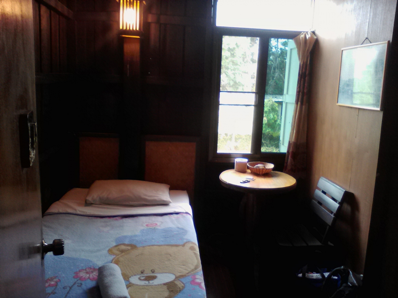 シャワー,トイレ共同のファンのシングルルームをBooking.comで予約しました。150B。部屋はかなり狭いですが清潔で感じはいいです。しかも客がほぼいなかったので静かでよかったです。しかーしこの時期はファンの部屋では結構暑い(特に昼間)。レセプションはA/Cが効いている日があるのでその日は涼めます。他にドミ(120B)やダブル、A/Cの部屋もあります。予約せずに行っても同じ料金です。自転車を無料で使わせてくれるのがグッドです。- 旅行時期