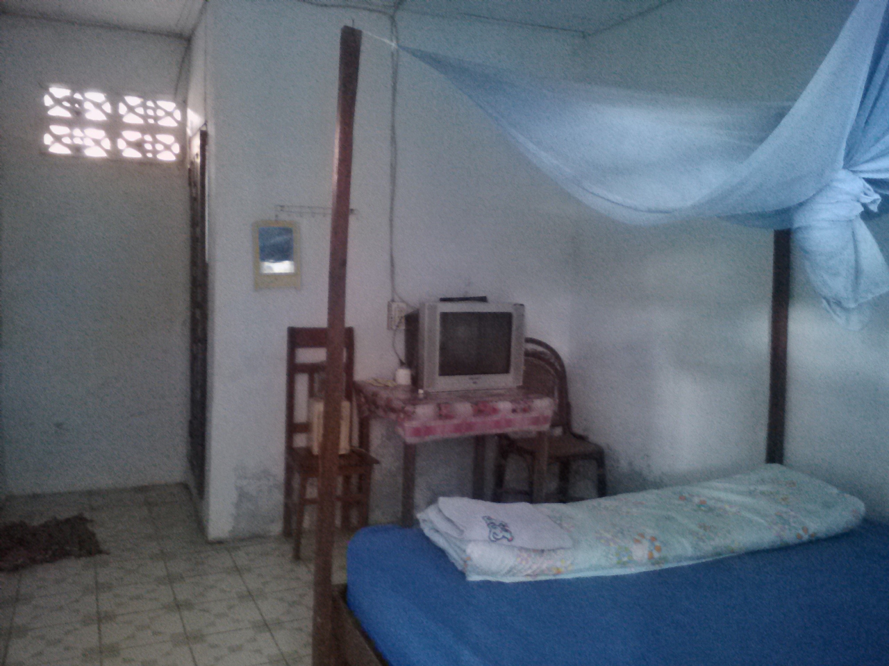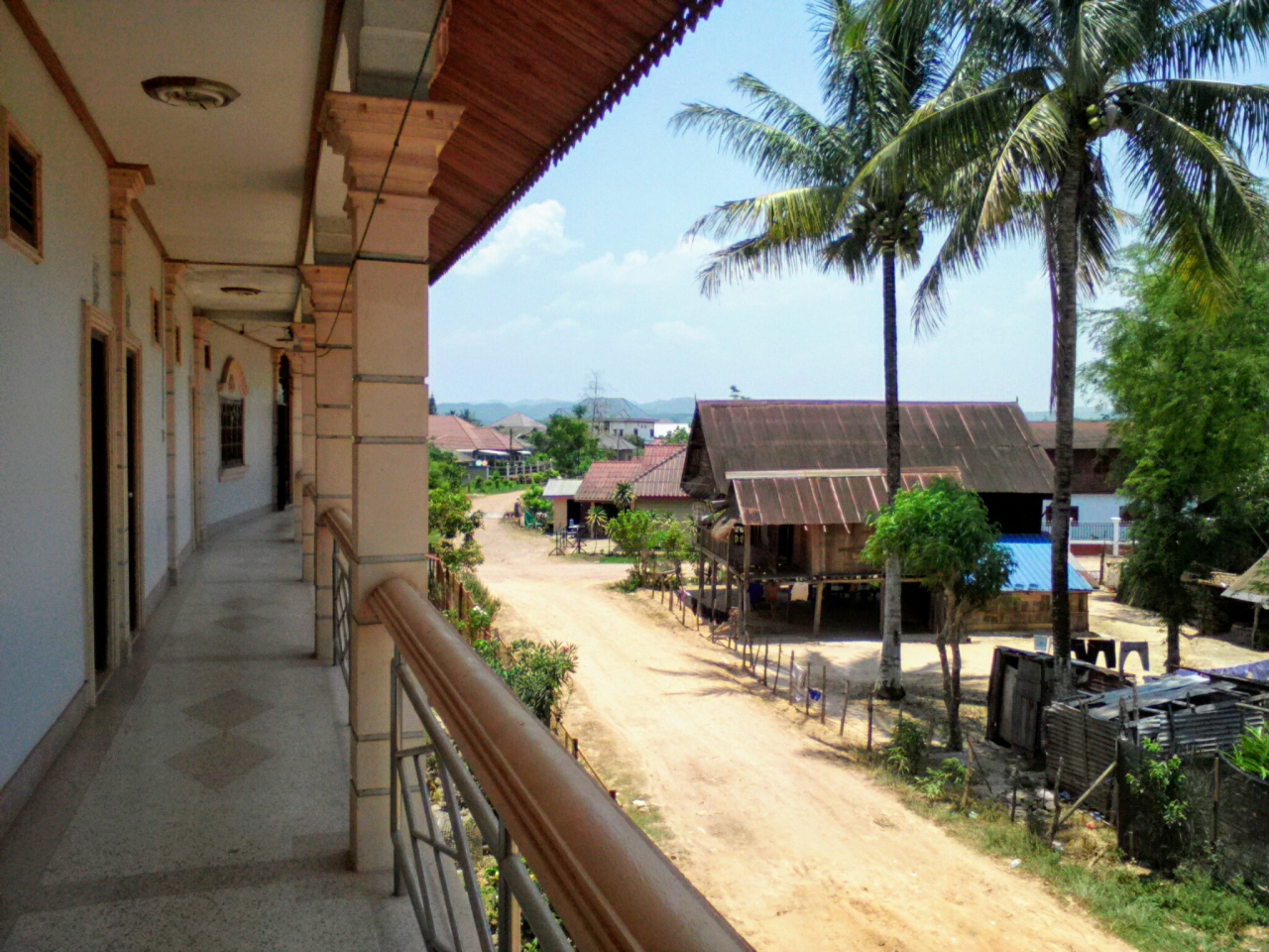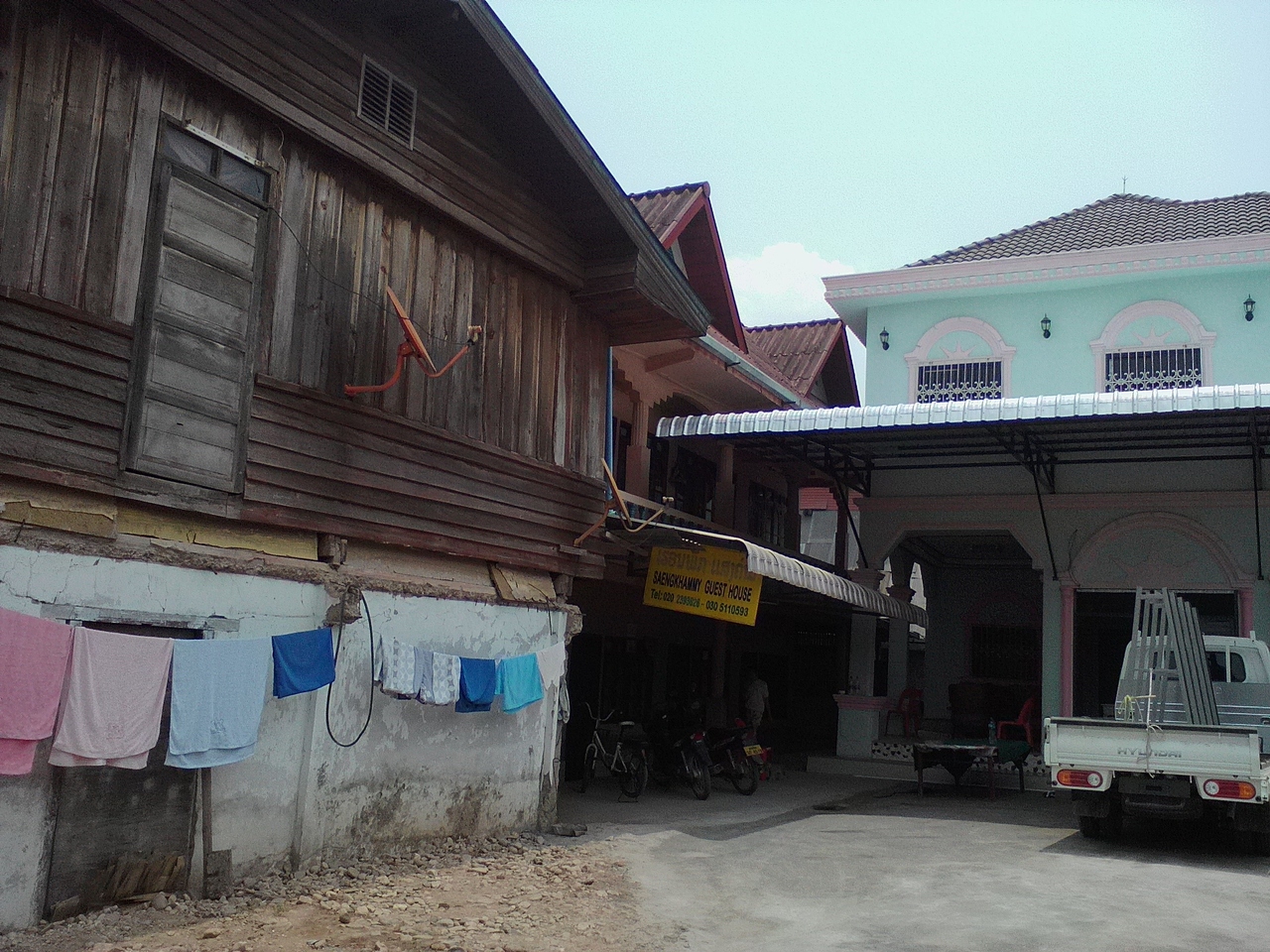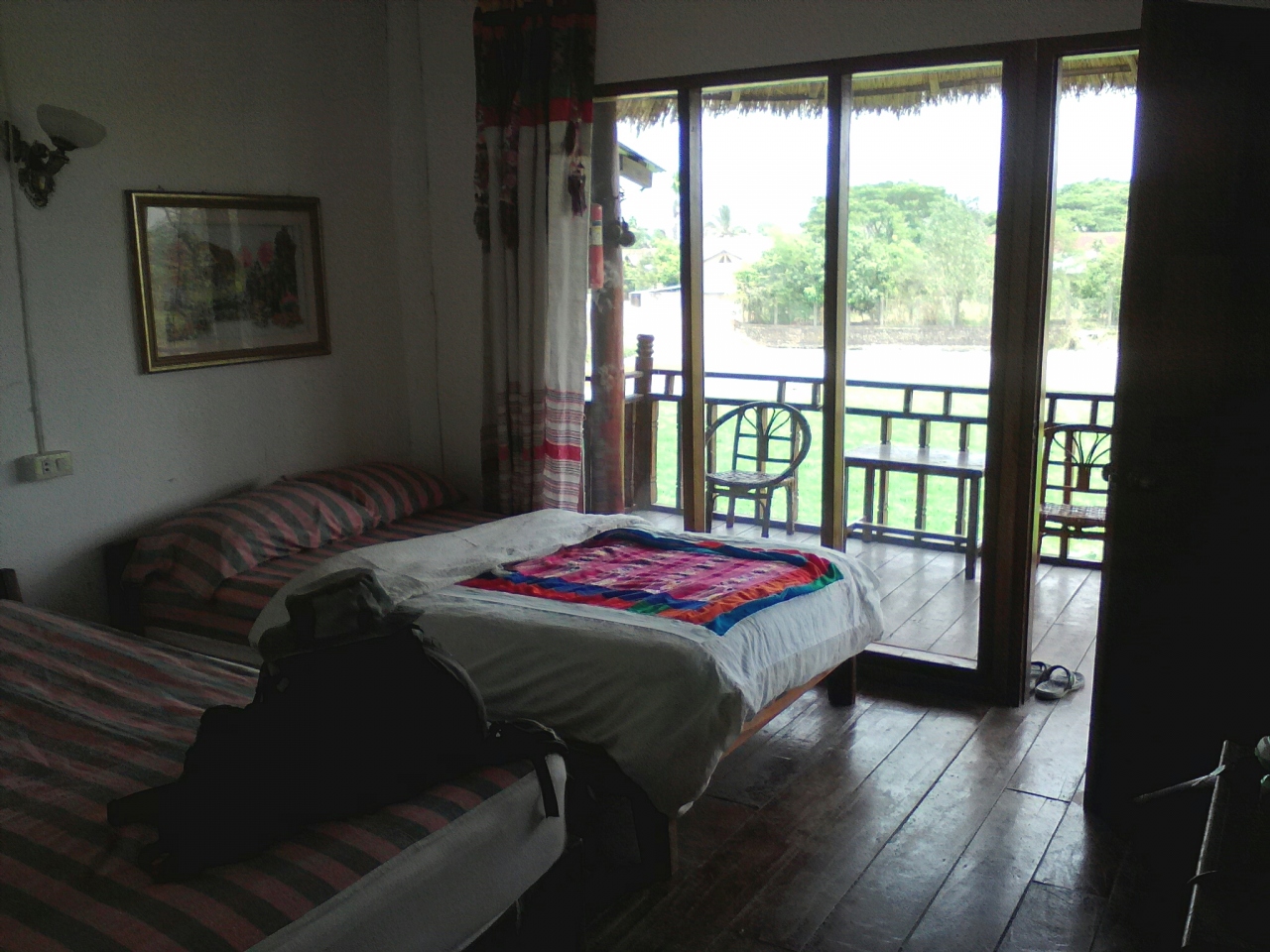 町の中心からやや離れた南国リゾート風バンガローのG.Hです。本来は8万kipだけど1人だから7万でいいと言われ、3泊するんで20万でいい?とお願いしたらOKがでたのでここに決めました。部屋には2ベッド、ファン、テレビ、シャワー(お湯)トイレがあり、バルコニーからの眺めもいいし開放感が味わえます。室内でもWifiOK。一応リゾート感は味わえますがやはり本物のリゾートではないので細部はやや問題あり。過度な期待は禁物です。しかし町中のG.Hに比べればこちらの方が断然落ち着けると思います。ローカル市場が近いのも便利です。
