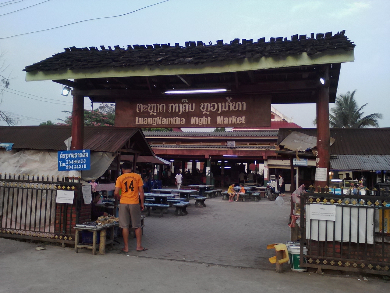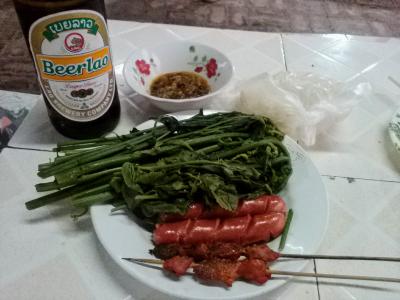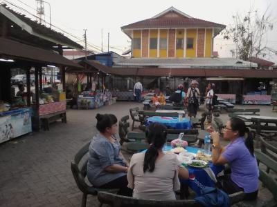 かなり小じんまりしたナイトマーケットです。焼き鶏や焼き豚、串系やラープなどのおかず、カオニャオなどがありますが選択肢は少ないです。ですが地元の人には結構利用されていて19:00頃にはかなり賑わっています。 数は少ないですがちゃんとテーブル、イスも用意されていて買ったものをその場で食べられます。1人だと量も多く割り高になってしまいますがお願いすれば少量でも売ってくれる所もあります。串系6本(1本1000kip)、カオニャオ2000kip、葉っぱ2000kipの計1万kipでお腹いっぱいになりました。ビールは向かいの商店で買えます。