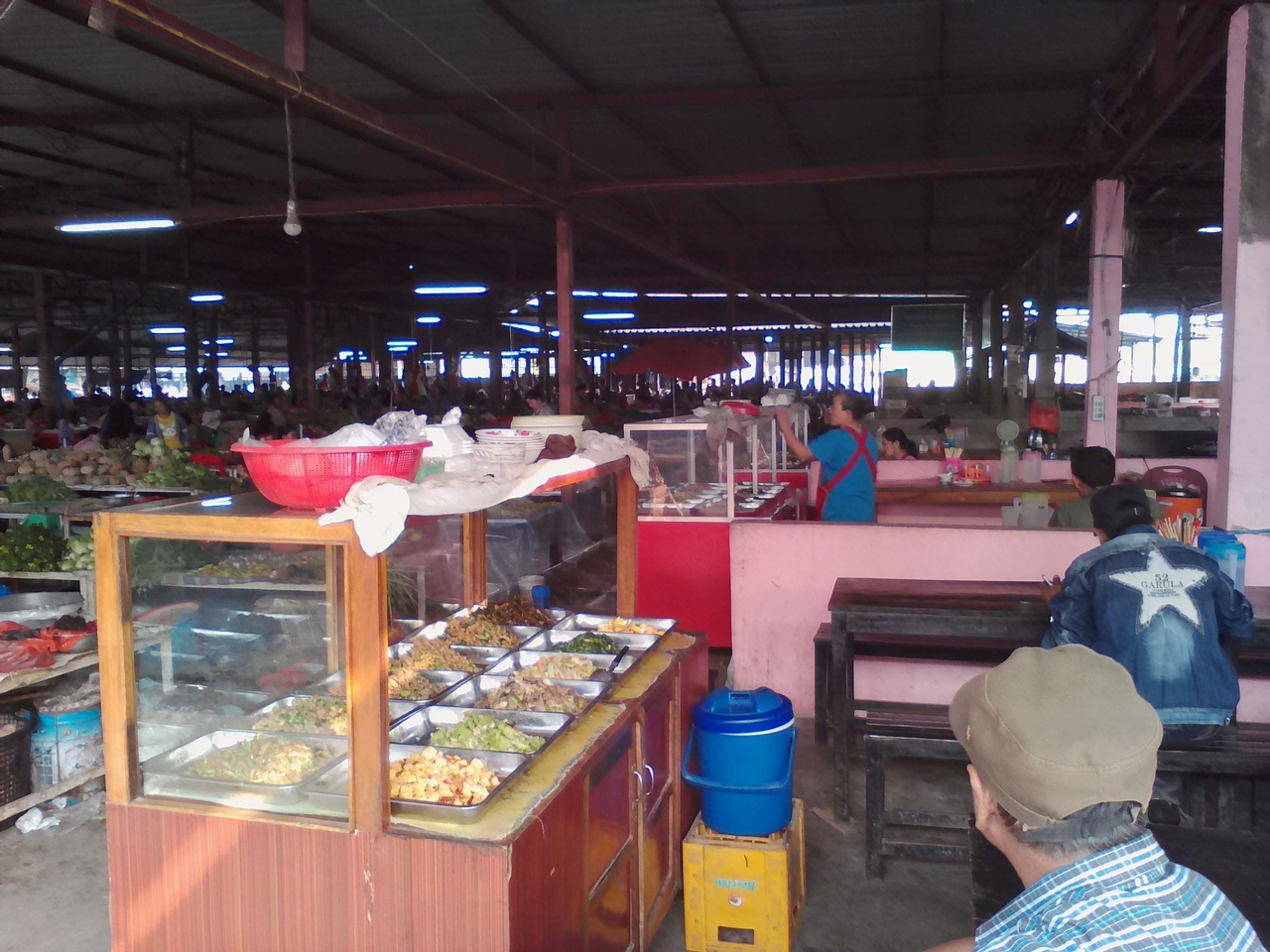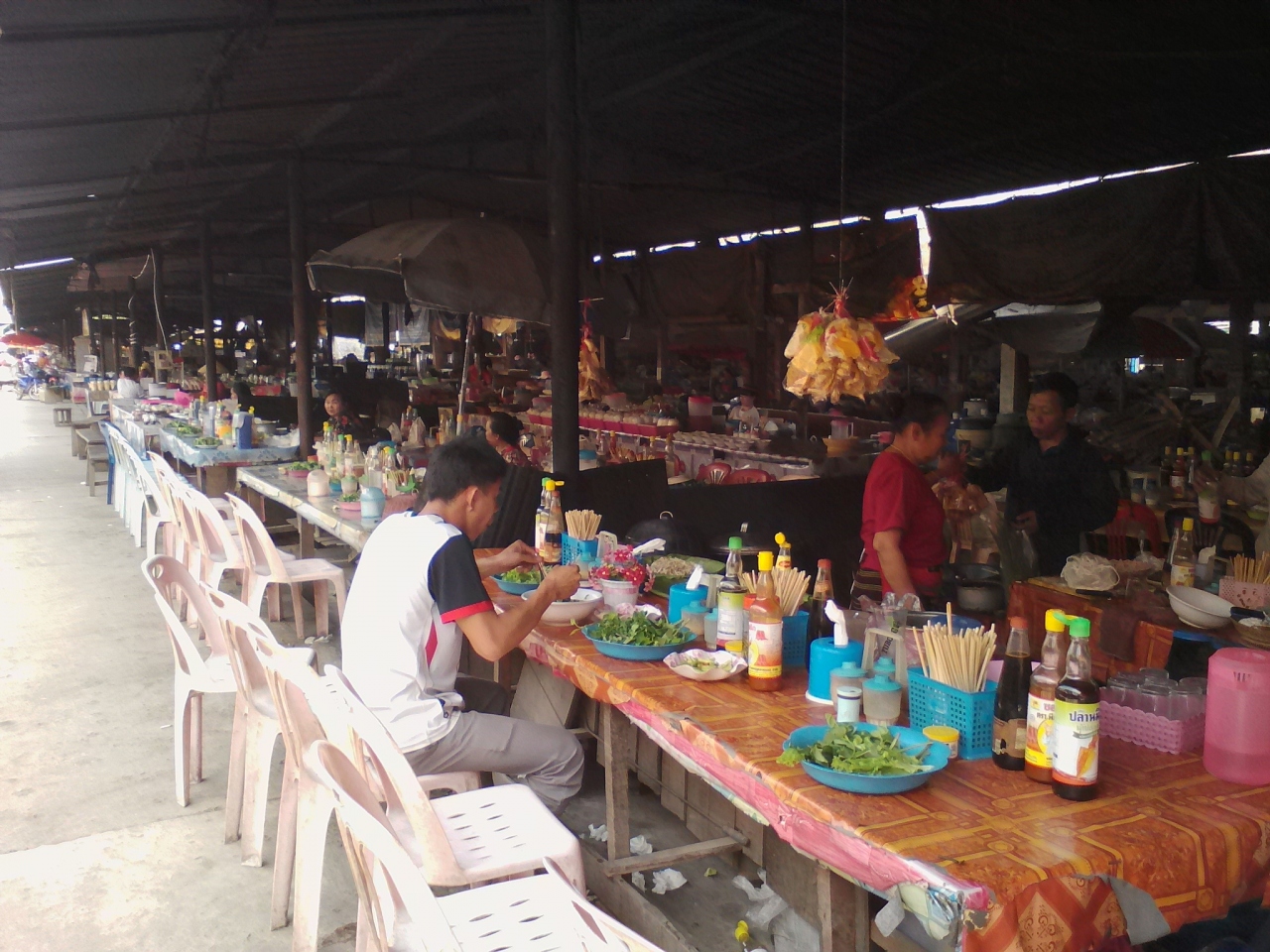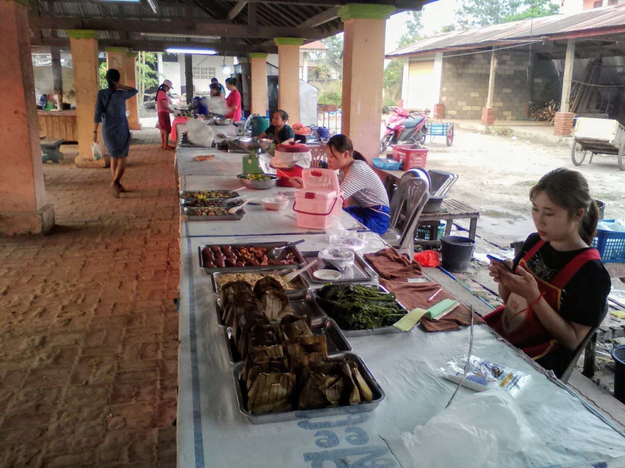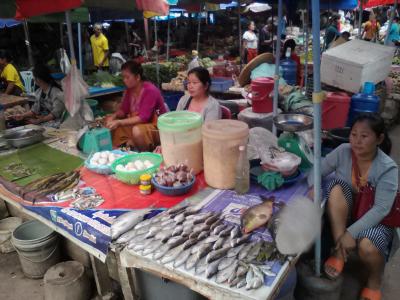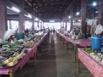 ムアンシンという田舎町の規模にしたらかなり巨大で充実した市場です。特に飲食コーナーがすごい。カオソイやフーを出す麺の店がずらり、そしておかずをチョイスしてご飯に乗っけてもらう定食屋も10軒ほどありどこで食べようか迷ってしまうほど。なので朝飯、昼飯にはこと欠きません。麺も定食もどちらも1万kipで食べられます。お腹いっぱい食べたいなら定食の方をおすすめします。しかし営業は夕方まで。中には18:00ころまでやっているところもありますが売れ残っているおかずのみです。