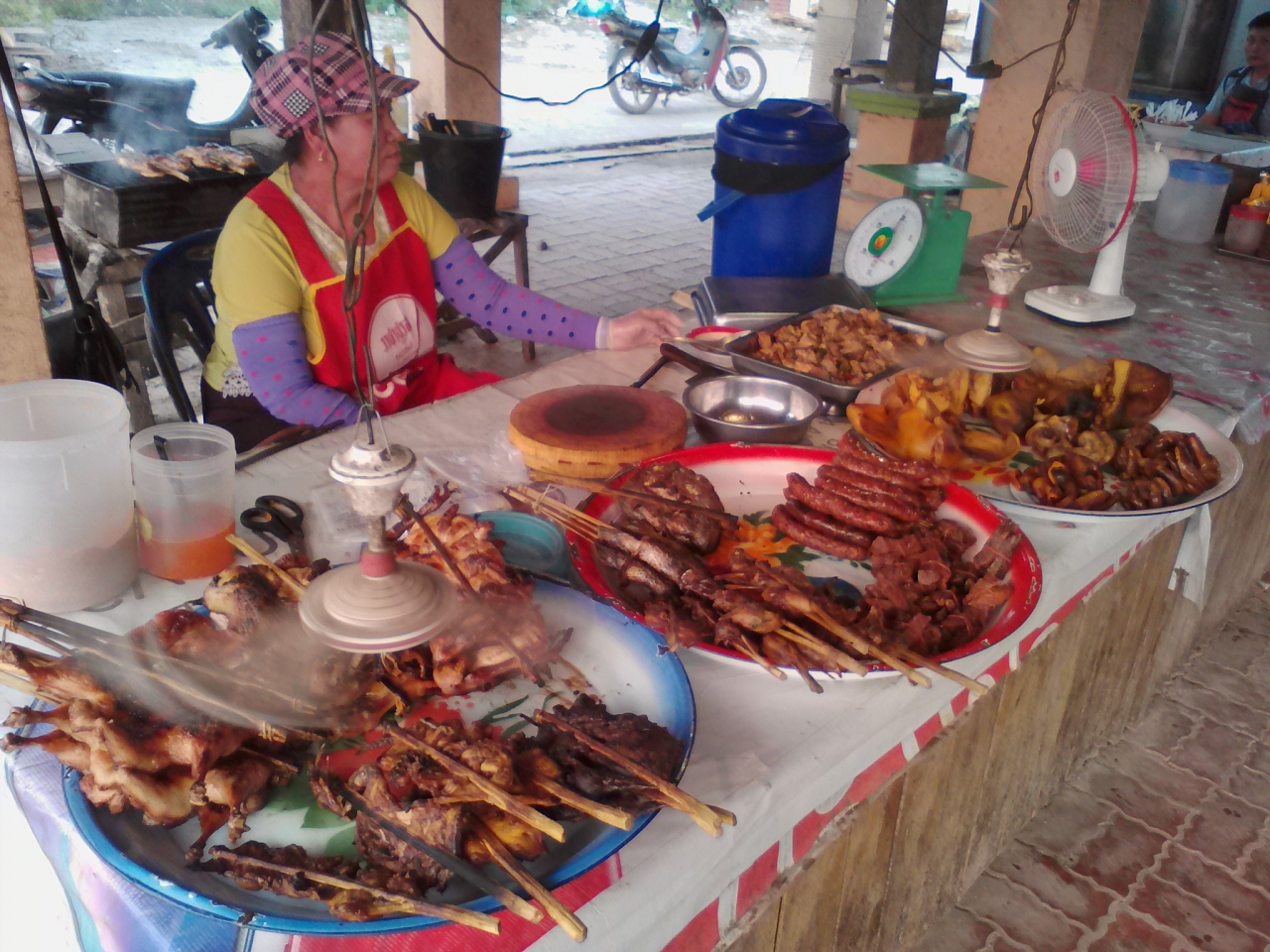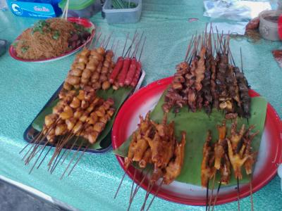 通り沿いの入口を入るとテーブルが置かれたスペースがあり周りに屋台が並んでいます。鶏の丸焼き(3万kip)、豚や鶏の串(1本2000kip)、ソムタム(1万kip)、アヒルの孵化卵(3000kip)、フライドライス,ヌードル(5000kip~)、ビアラオ大びん(1.2万ドン)などがあります。奥に入るとお惣菜持ち帰りコーナー(5000kip~)やおつまみ用に皿に盛られた肉や魚、野菜などがあり、そのままテーブルに持っていって食べることができます。旅行者にとっても手軽に食事ができますがやはり複数人で行った方がいろいろシェアできて楽しいと思います。当然ですが昼間はやっていませんのであしからず。