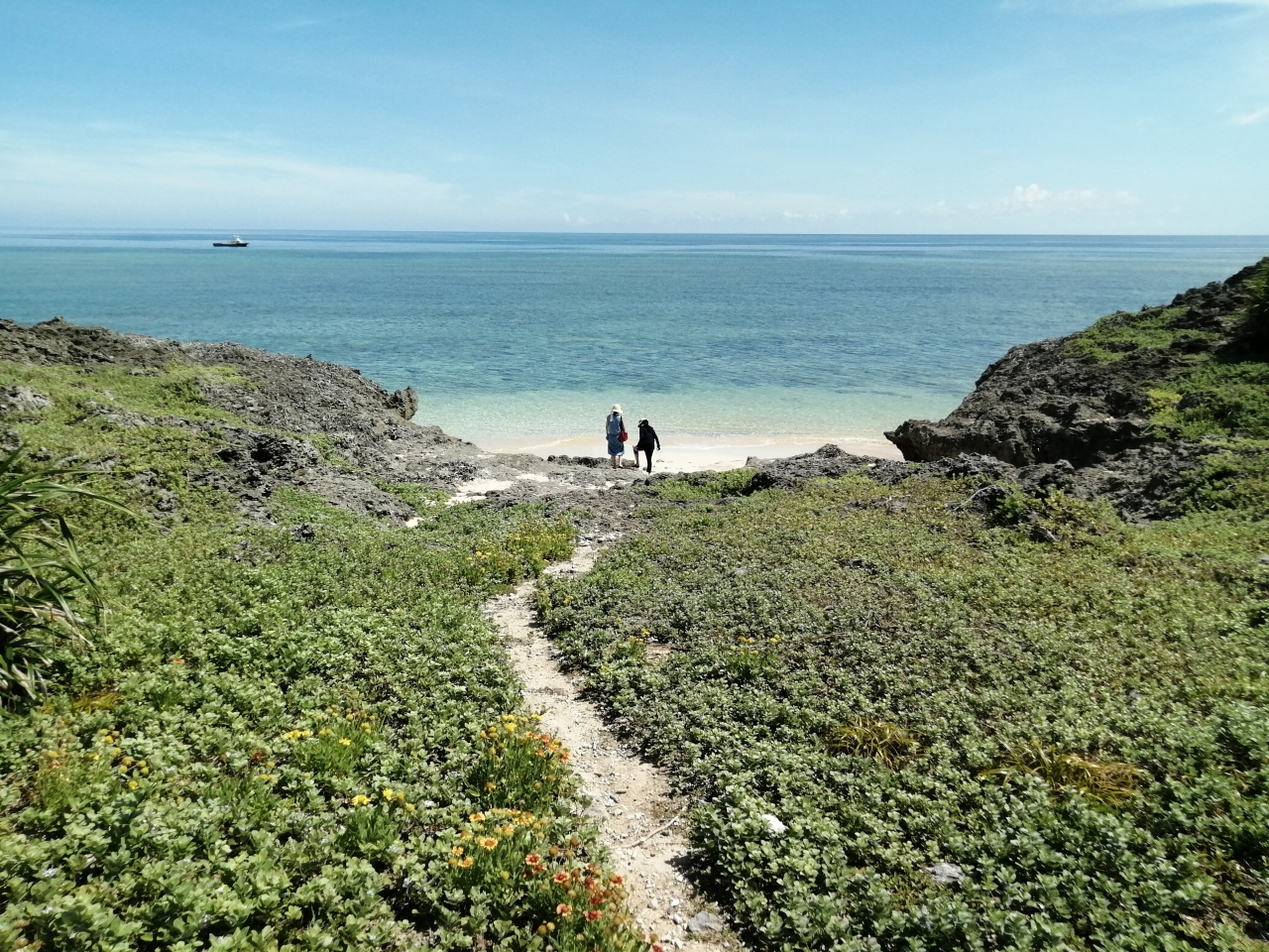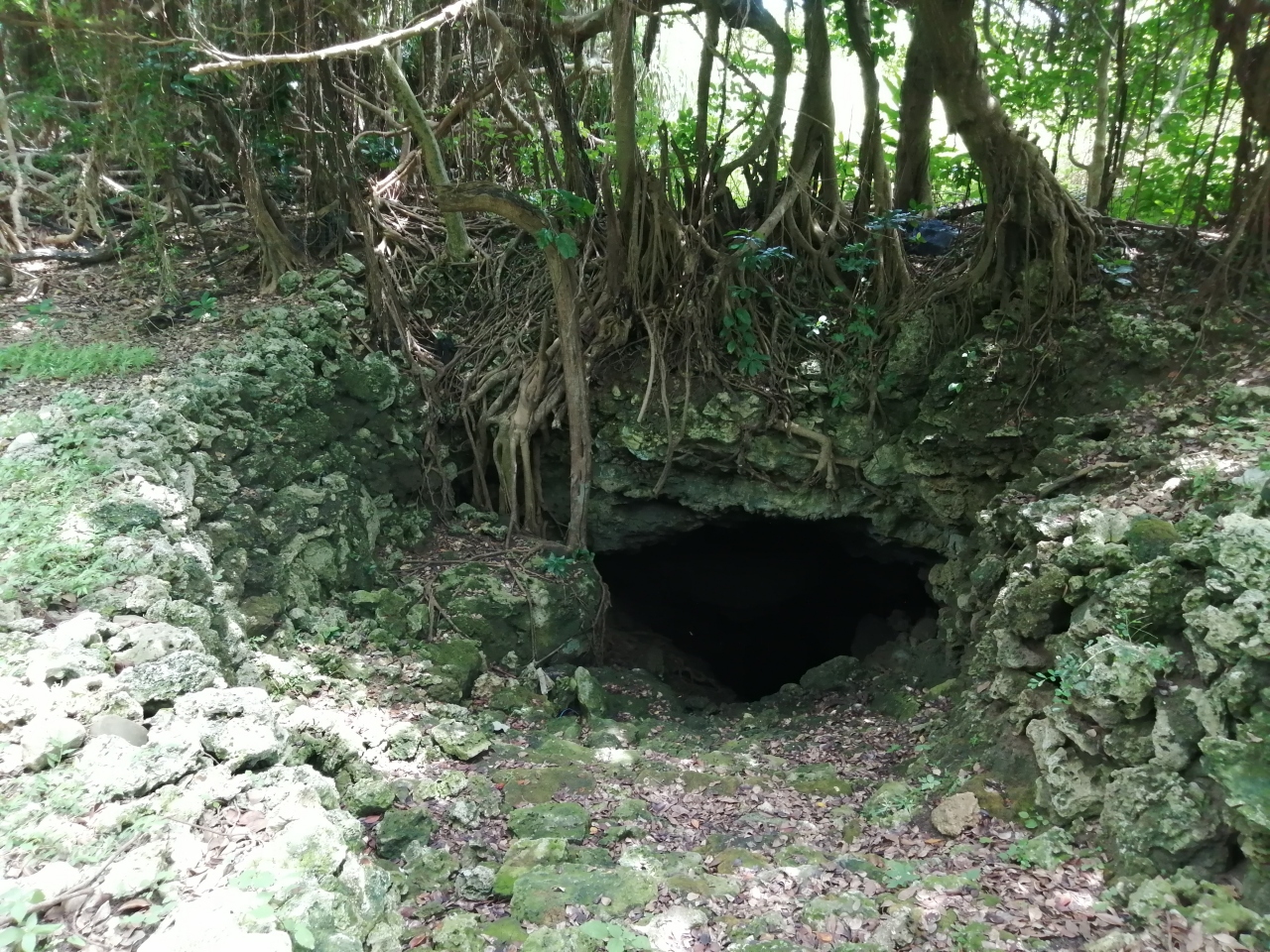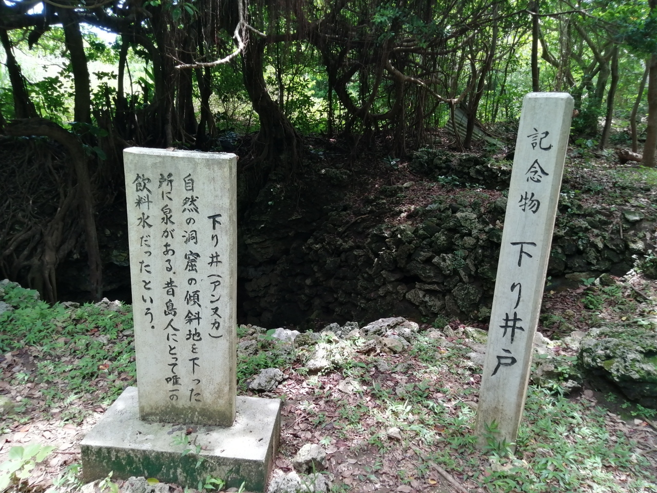 鳩間島には昔からの井戸は3箇所。その中で唯一整備された“観光地”っぽい井戸です。「記念物 下り井戸」と書かれた石柱と由緒板もあります。傾斜の先には洞窟があり、その中に水が湧いています。昔の人々には大切な飲料水だったようですが、なんか怖くて中に入れませんでした。