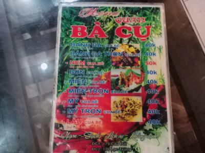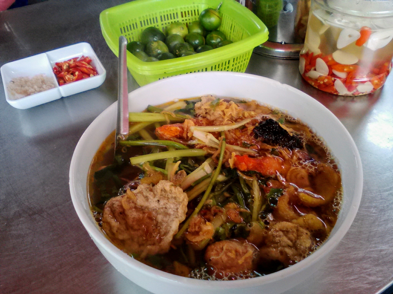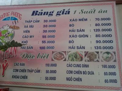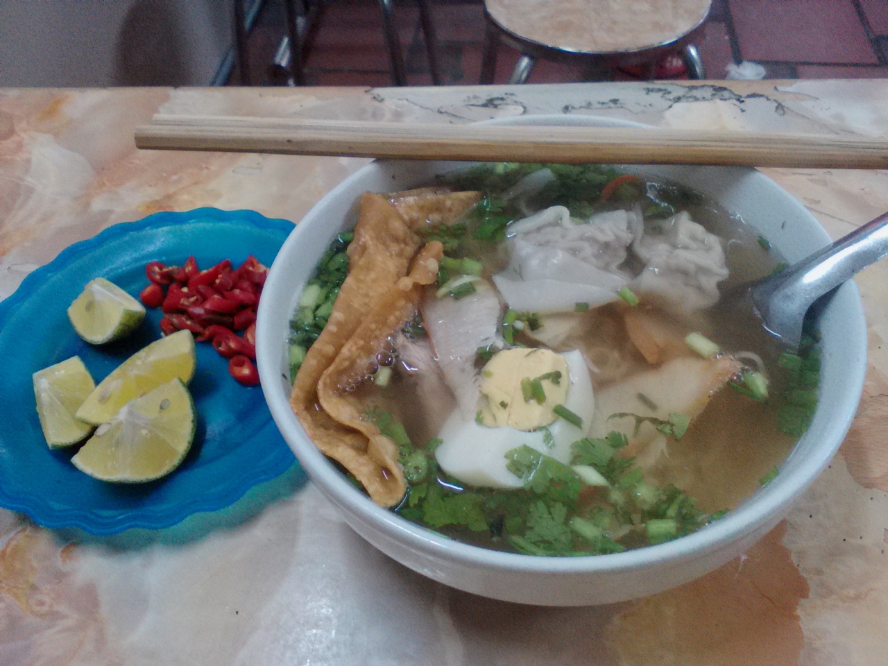 ワンタン麺のお店です。一番スタンダードな「THAP CAM(タップカム)」(メニュー参照)をオーダー。タップカムとはミックスとか全部(乗せ)とか言う意味で“具材いろいろ”ということです。見た目はやはり豪華です。具材としてはワンタン、チャーシュー、揚げワンタン、ゆで卵、パクチー、ネギです。スープは豚のダシが出ていますがやや薄味、ライムやヌックマム、しょう油、チリソースで味付けします。まぁ、普通においしいですが特にワンタンがうまいです。タップカムにしたので2つしか入っていませんでしたがもっとあってもいいと思います。ベトナム語でどうやって注文したらいいかはわかりません。これでお値段3万ドン。まぁお得かなと思います。