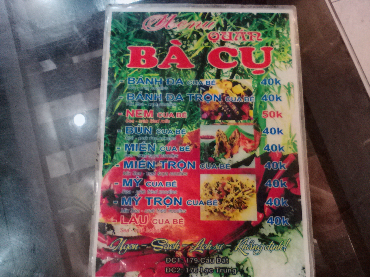 麺は茶色のきしめんタイプで超具だくさん、もしかしたら勝手にDac Biet(スペシャル)にされたかもれません。だったら3万は納得です。お味は……まあ、うまいと言えばうまいのですが特に蟹の味や風味は感じられませんでした。私がただの味オンチなだけかもしれませんが…。ひょっとしたら「140」の方のがうまいかもしれませんが味覚に自信がないので食べ比べはしませんでした。けどどっちが本当の有名店なんでしょうか?- 旅行時期