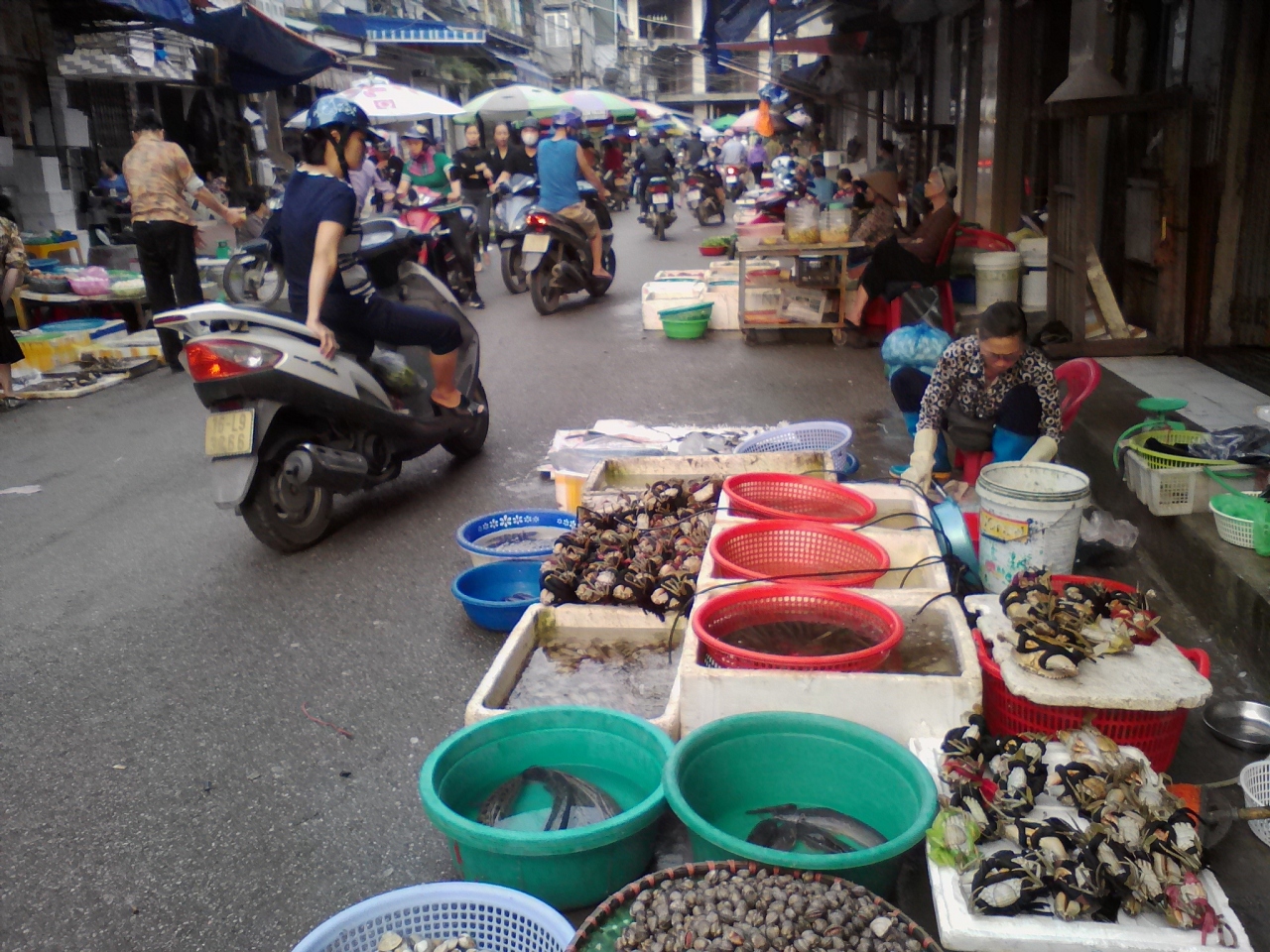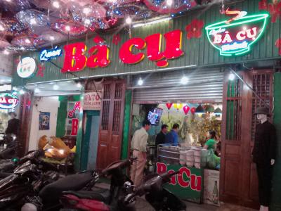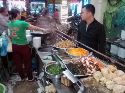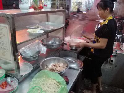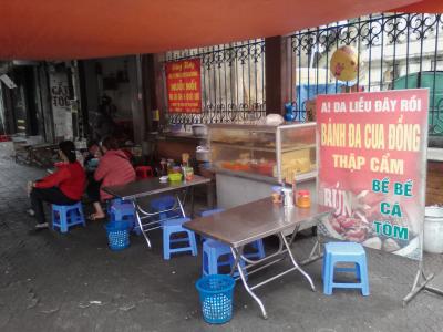 ハイフォン名物Banh Da Cuaの有名店のようです。“店”ではなく屋台です。しかし地図の付近には2つの屋台が…。一方は看板の住所が「140 Tran Phu」、もう一方は住所の記載はなく「138」の近く。で、「138」の方で食べてみました。まず値段を聞くと3万ドン。路上の屋台の相場は2万〜なので少し高いと思いましたがオーダー。