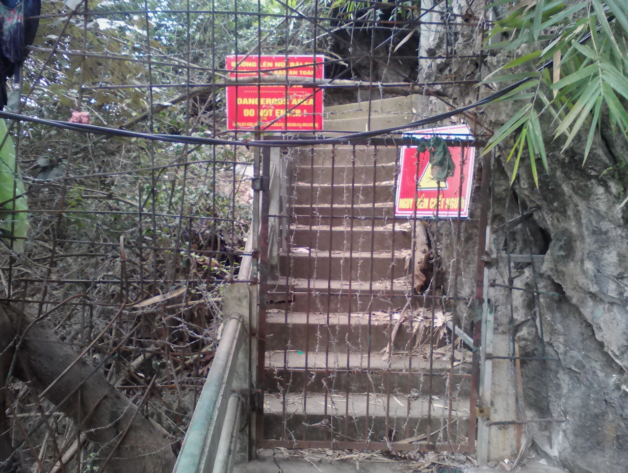 ハロン湾を一望できる隠れスポットです。場所はホンガイ側ハロン市場の西側。頂上に鉄塔のようなものが建っているのが目印です。登り口は時計塔からLe Thanh Tong通りを西へ約650m、Hang Noi 通りへ入った左手付近にあります。まずはネットで見つけた登り口①(住所102 Le Thanh Tongの向かって左側の細い階段)へ。ちゃんと上に続く階段がありましたが先の扉に鍵がかけられており立入不可。おそらく危険なので閉鎖されたようです。次に周辺の聞き込みで見つけた登り口②へ。①の少し先(Hang Noi通り住所番号86と90の間)です。細い階段を上がって行くとおばちゃんがおり「ノーノーノー」を連発。ここもダメかと思ったら「モッチャム」と…。どうも10万ドン(≒500円)払えということらしい。たぶんおばちゃん家の敷地内を通るのでその通行料のようだ。ふざけやがって…。いくらなんでも高すぎる。1万ドンで十分だと思い、差し出すと怒り始めた…。結局交渉は決裂しその後何を言っても全く相手にされくなり、ジ・エンド。ほんと強欲にもほどがある。ベトナム人腐ってますね。