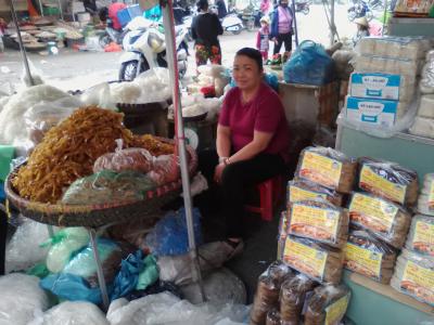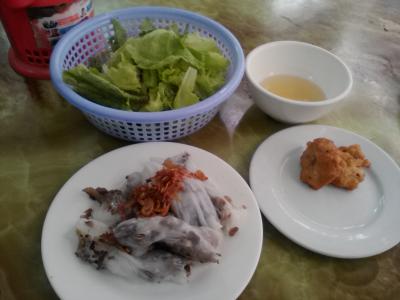 チャームックとセットになったBanh Cuonが3万ドンというので食べてみました。チャームック(Cha Muc)とはイカのすり身揚げのこと、日本風に言えばイカのさつま揚げです。ハロン市場などでよく売られています。たかがイカのすり身揚げと言うなかれ、なかなか値の張る高級食品です。1kg40万ドン(≒2000円)ほどします。ベトナムの物価からしたらなかなかのお値段です。味見したくて市場の店で1個(直径7~8cmほど)ちょうだいと言ったら2万ドン(≒100円)と言われました。高い。