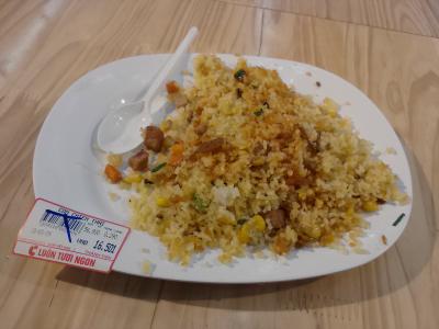 1階はアパレルなどの店が入ったショッピングエリアでスーパーマーケットは2階になります。品揃えは他の町の店舗と変わりませんがこの店舗のいいところはデリコーナー、お弁当が充実していること。なんとデリの真ん前にイートインスペースがあり、買ったものがすぐその場で食べられます。ちょうど昼頃だったのでチャーハン(コムチエン)をいただいてみました。デリなので好きな分よそってもらい重さを量ってお会計ですが、値段を言えばその分だけよそってもらえます。実際にはぴったりにするのは手間がかかるのでだいたいですが…。私は15000ドンとオーダーし、16501ドンでした(実際の支払いは16500ドン)。明朗会計で注文しやすくてグッドです。しかしもう少しきれいには盛れないのかなぁ、まぁそこはご愛嬌と言うことで…。昼頃はなかなかの人で混み合います。ただ場所が市内中心部からやや離れているため残念ながら利用価値はやや低いかなと思います。