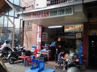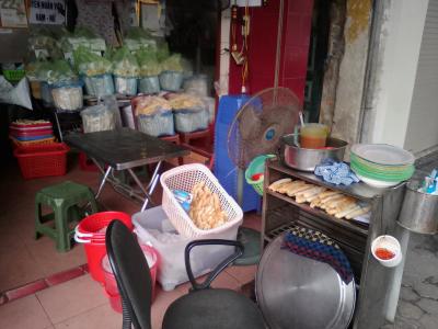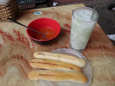 ハイフォン名物のB級グルメ、バイン・ミー・チャイのお店です。バインミーチャイとは細長いパンにパテを挟んだシンプルなもの。それに辛いソース(チャイ)をかけていただきます。食事というより皆、おやつ感覚で食べています。小さくておいしいのでどんどん食べられます。最初、様子見で3本しか頼みませんでしたが後で2本追加ました。お値段は1本2000ドン、チェーは1杯1万ドンです。この安さも魅力の一つです。