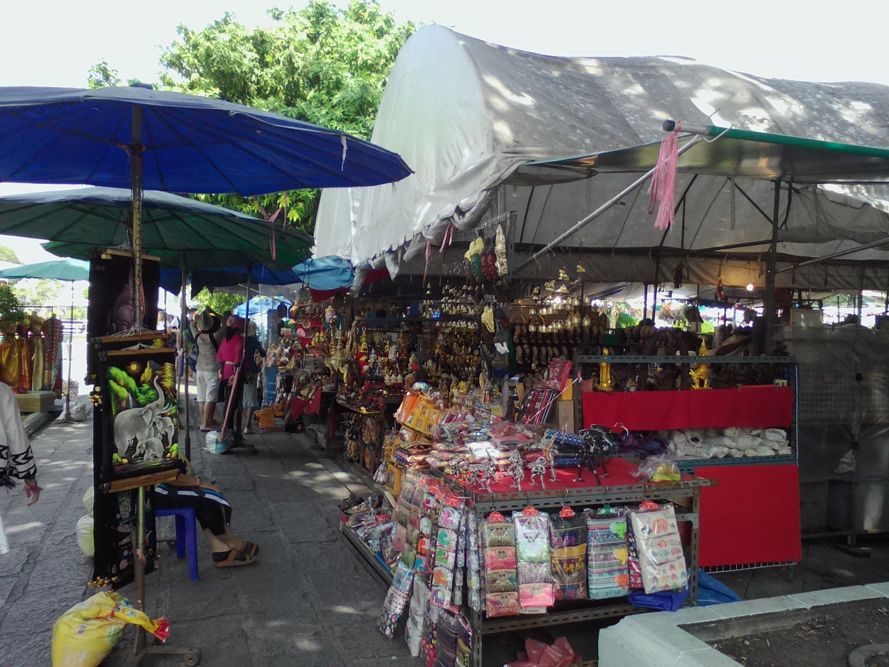 ワットアルン前にある露店の土産物屋です。このエリアは入場料(50B)は必要ありません。バンコクでも有数の観光地にある土産物屋ですから値段はもちろん高いです。わざわざこんなところで市内のどこにでも売っているような土産物を買う必要はまったくないと思いますがパッケージツアーなどのあまり自由度のない旅行者の方は買わざるを得ないかもしれません。多少のディスカウントはしてくれるかもしれないので一応交渉はしてみて下さい。土産物屋はさておき、ここからのワットアルンの大仏塔の眺めがとてもいいです。