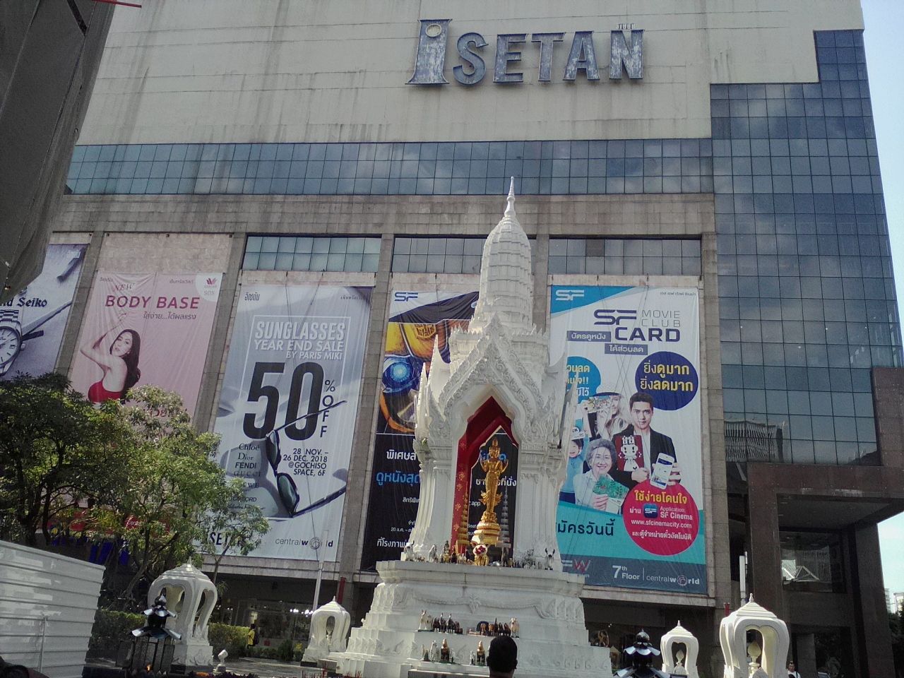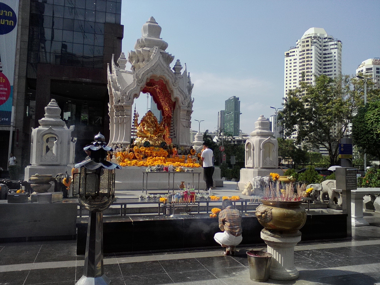 バンコクのど真ん中、伊勢丹デパート前に鎮座しているのはガネーシャとトリムルティーの2体の神様。どちらも金ピカでいかにも御利益がありそうです。ガネーシャは成功、学問、仕事、幸運、商売。トリムルティーは恋愛、健康、仕事、幸運、お金の願いが叶うようです。2つともお参りしておけば最強だと思います。タイ人に混じってお祈りしてはどうでしょうか。