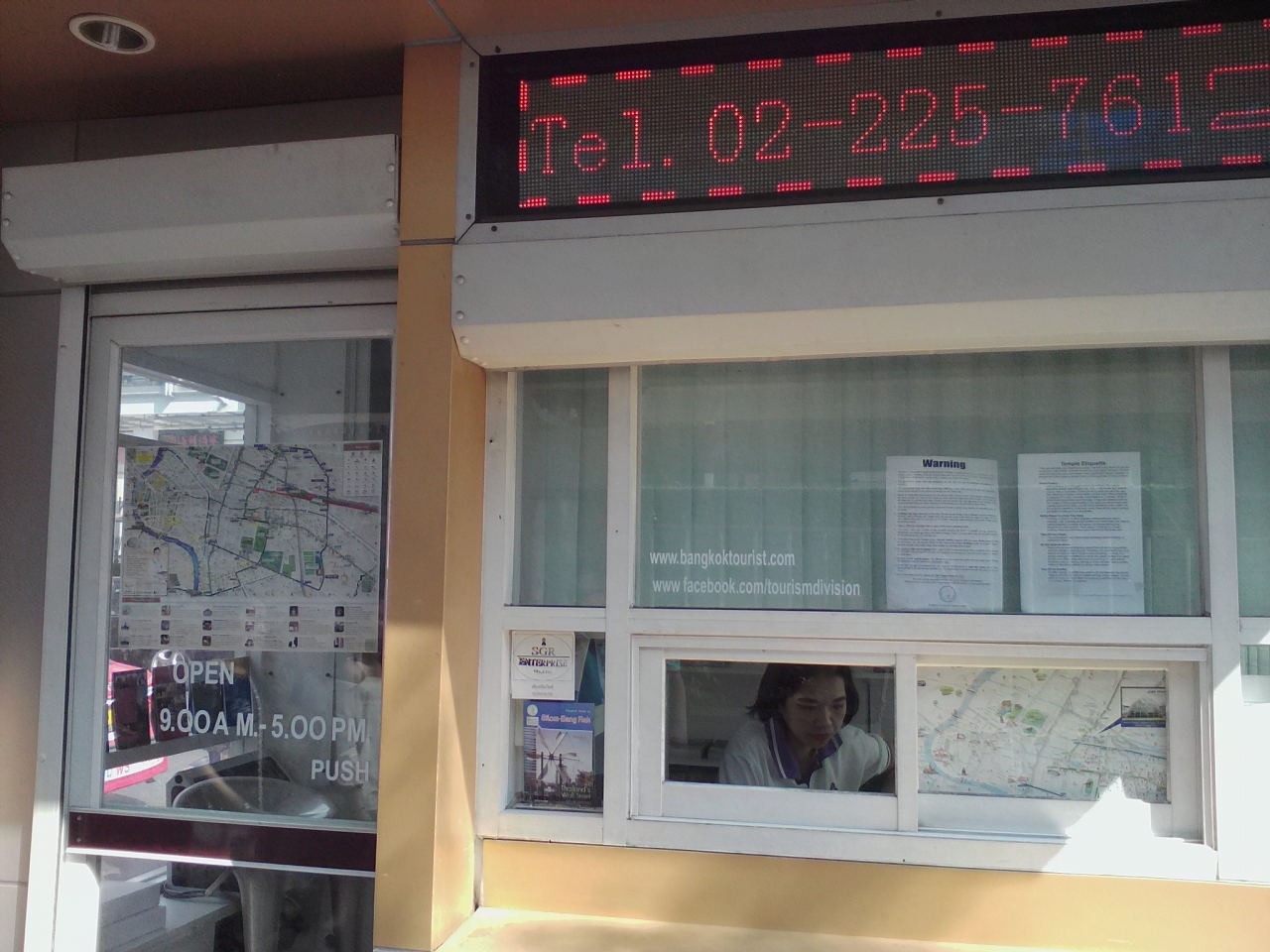 ファランポーン駅の中ではなく駅前のラーマ4世通り沿い、地下鉄入口にあるツーリストインフォメーションです。いつも閉まっている印象があり、今回も人気がなく閉まっているのかなと思いつつ窓を覗き込んだら突然窓を開けられ驚きました。最近はちゃんとスタッフがいるようです。市内マップや各種パンフがもらえ、英語による案内をしてもらえます。