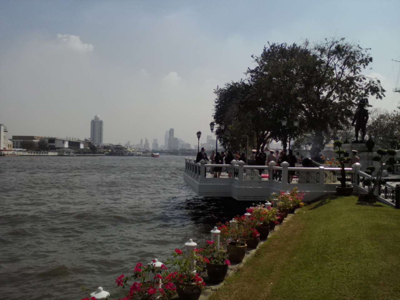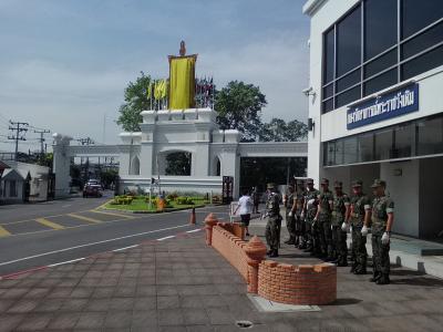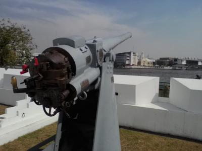 ワットアルンの隣りにあります。ごっついゲートで警備が厳しそうでしたが、入口で川沿いにある砦を見たい旨を告げるとあっさり入場が許可されました。特別な場所以外は自由に歩き回れるようです。で、敷地内を横切りチャオプラヤー川沿いへ。砦の傍らにはタクシン王の像があり多くの人が参拝に訪れていました。その先には目当てのウィチャイ プラシット砦が…。チャオプラヤーエクスプレスに乗った際に目にしている砦を内側から見られて感激。古い大砲と一緒に現代的な大砲も残されており実際に触ることもできました。