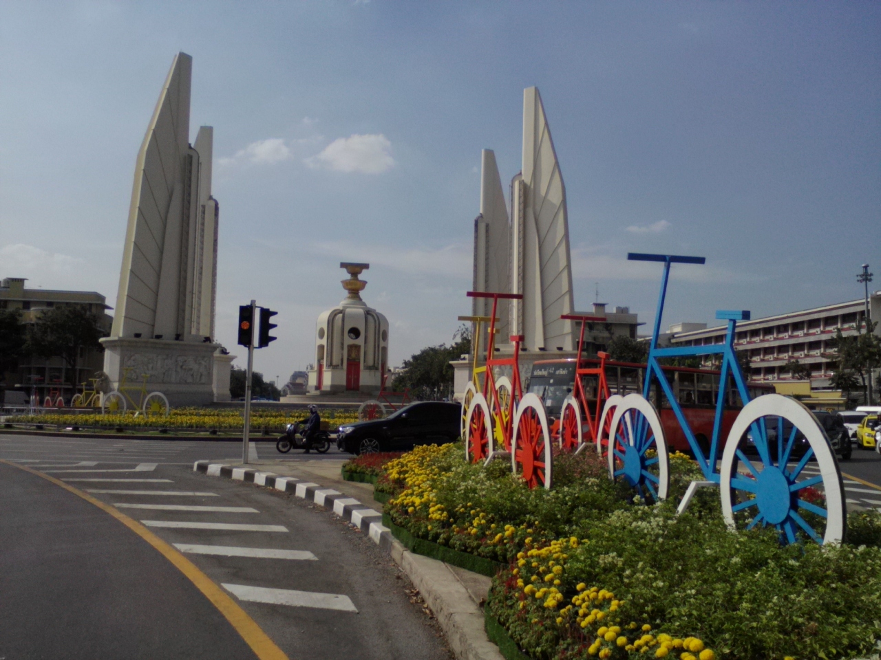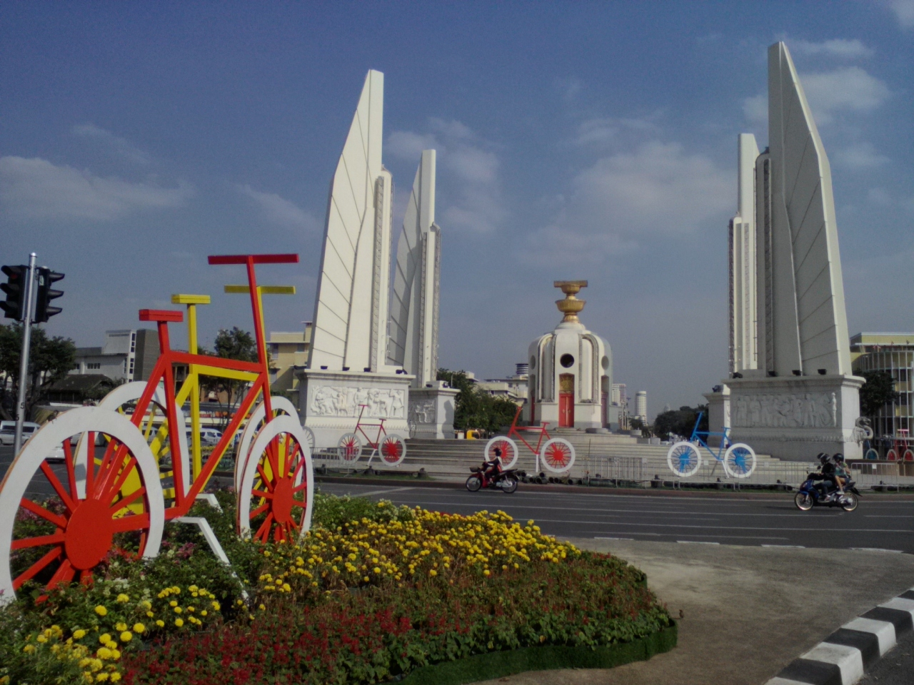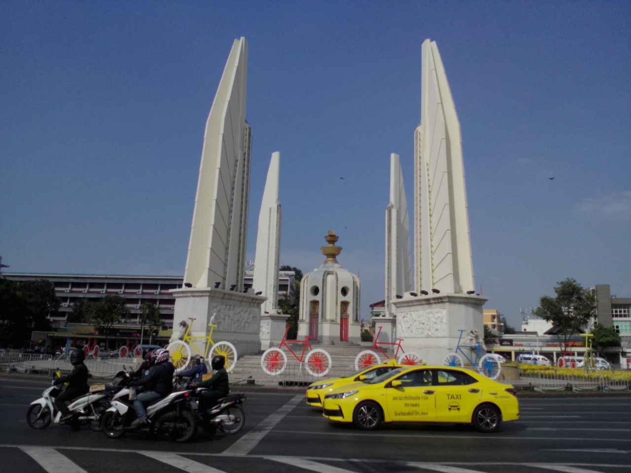 カオサンエリアに宿泊したことのある方なら馴染み深いんじゃないんでしょうか。時間帯によって、日によって様々な顔を見せてくれる民主記念塔ですが今回は塔の周りに何やら自転車のオブジェが…。昨今のタイでの自転車ブームを反映したものでしょうか。毎回楽しませてくれる民主記念塔、いいですね。