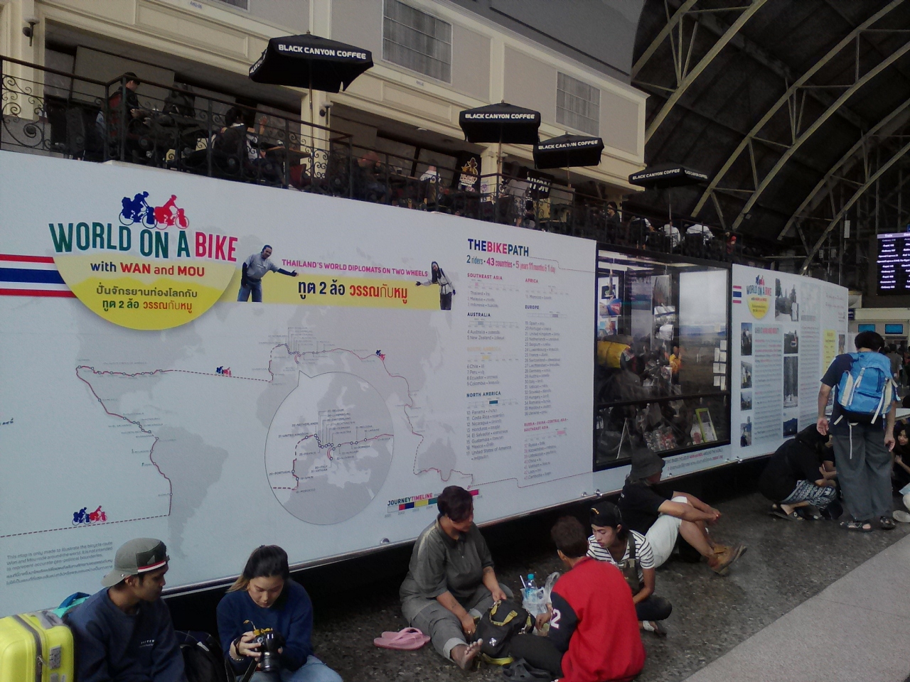 待ち合いフロアには時期によって様々な展示がされていますが今回はタイ人初の自転車による世界一周を成し遂げた夫妻を紹介するものでした。ルートや実際に使用した自転車や装備などが展示されており、列車の待ち時間に楽しませてもらえました。- 旅行時期