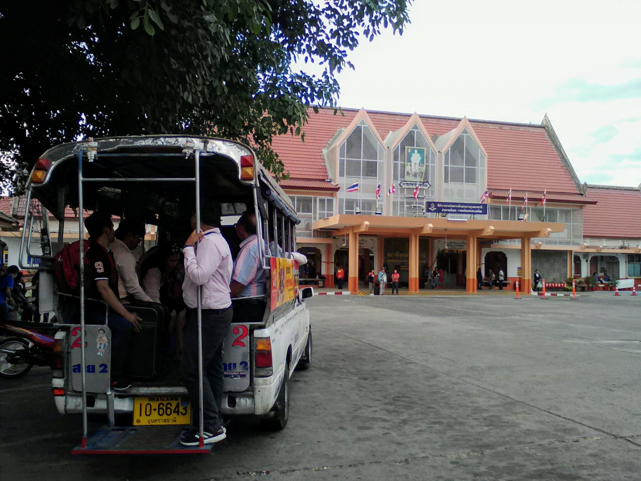 ウボンラチャタニー駅から市内中心部に行くには駅前で待機している(やって来る)2番のソンテウの利用が便利です。このソンテウはワーリン市場付近を回ったあとムーン川を渡りウボン市内に入ります。降りたい場所を事前に運転手に言っておくか、自分でベルを鳴らせばどこでも停まってくれます。料金は10B(おそらく一律)。タクシーなんか使う必要はありません。
