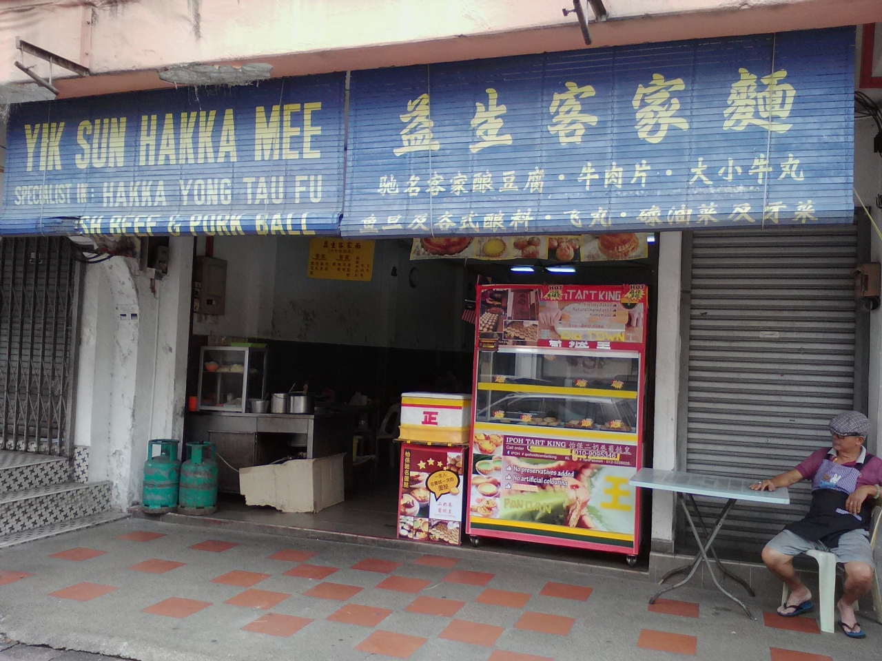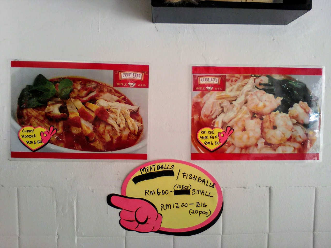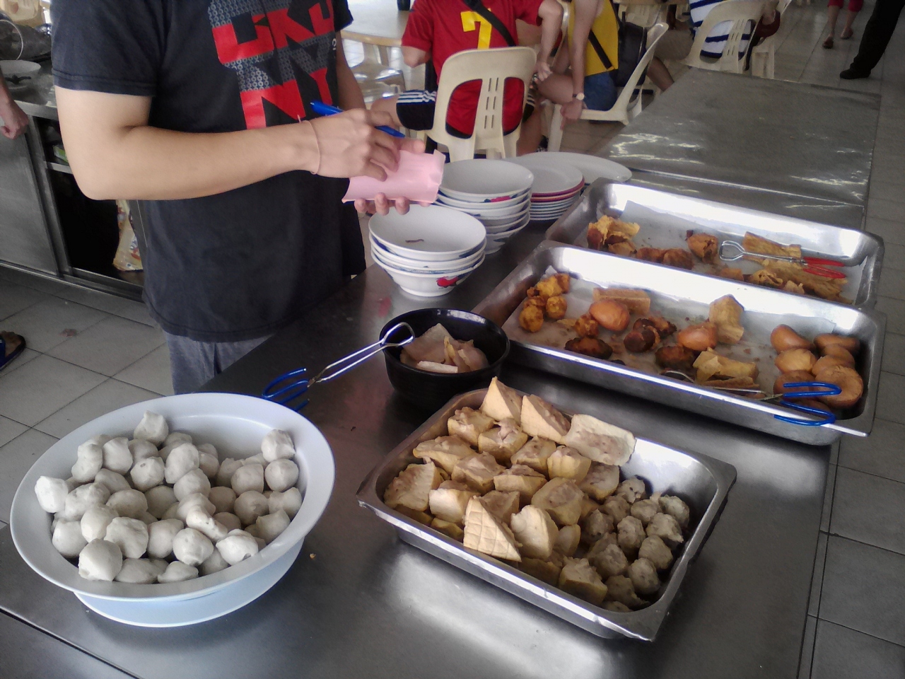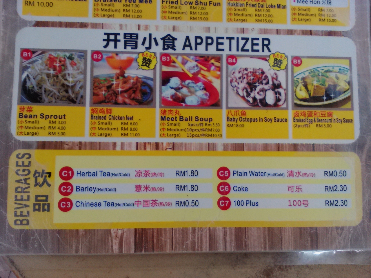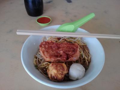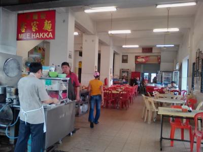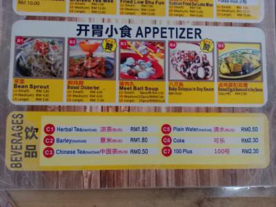 客家麺(Hakka Mee)の専門店。客家麺とは汁なし中華麺にひき肉などを乗せたジャージャー麺のようなものです。この店は麺の量とトッピング(麺とは別々に出てきますが…)を選ぶシステム。詳しくは写真のメニューを参照して下さい。朝早かったし、味見も兼ねてシングルのフイッシュボール1、ミートボール1(計4 .6RM)と軽めにオーダーしました。で、お味は…うまーい!豚ひき肉がご飯が欲しくなるようないい味で(店にはご飯はありません)、麺の下に隠れているもやしはしゃっきしゃき。すべて混ぜ混ぜしてから食べます。ミートボールは豚肉でこれまた絶品、スープもいいダシ出てる。全てが完璧で非の打ち所のない一品です。このうまさならダブルでも楽々イケそう。200%おすすめです。
