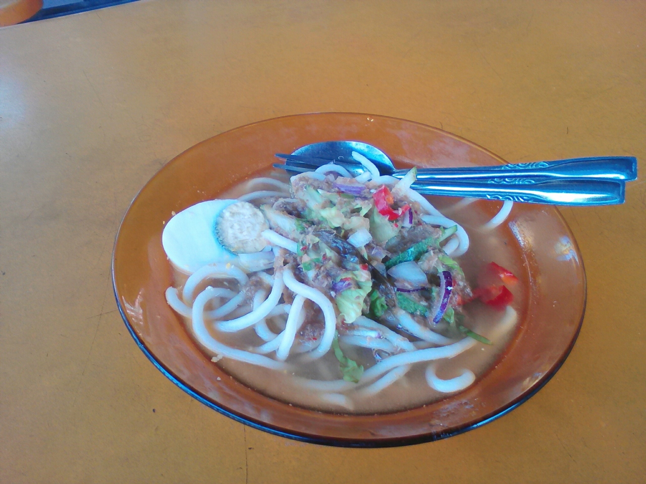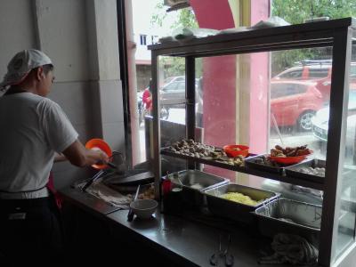 旧市街にある中華食堂。おかずをチョイスしご飯に盛ってもらうスタイルのお店。もちろん店内で食べられますがテイクアウトしていく地元客も多いです。また、麺も食べられます。私はこちらをチョイス。まず麺の種類とスープかドライを決めます。具材は肉や練り物系があるのですがこれは1個いくら、あれはいくらと言われ面倒くさかったので魚の練り物系で5RMでおまかせ。ドライにしたので麺と具が別々に出てきました。さてお味は…ドライの麺はほぼ味なしでかなりいまいち。スープに入ったつみれとはんぺんは当たり。スープは若干味が濃いですがまるでおでん汁のようでおいしかったです。このスープで麺も食べたかった…。ドライはやめたほうがいいと思います。