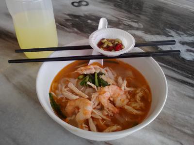 主力メニューは3つ。カレーヌードル(チキン&ポーク、チキン&プラウン)、Traditional Riceというナシゴレン。どれも6.5RMです。店名にもなっているカレーヌードルが目的だったのでチキン&プラウンをオーダーしました。麺はコシのまったくない米粉麺、メニューの写真よりも具材の鶏肉とエビのボリュームがないのはご愛嬌でしょうか。で、お味は…うまい!しっかりとダシの出たスープがなかなかイケます。が、テーブルに乗っているレモン汁(業務用っぽい)やチリ入りのしょう油を投入したらすっかりダシの風味がなくなってしまいました(入れ過ぎたかな)。みなさんご注意を。あと量がちょっと少なくもの足りませんでした。