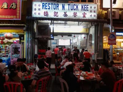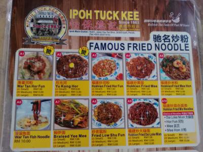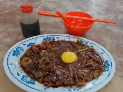 創業1963年のフライドヌードルの老舗店。大人気の店で毎日多くの客で賑わっています。メニューには写真と値段が載っているのでとてもわかりやすく簡単にオーダーできます。イチ押しマーク?の入った月光河(Yu Kong Hor)をオーダー。大中小とありますが1人なら小でいいと思います。お値段8RM。なんと生卵が乗っかってます。海外で生卵なんて大丈夫?なんて思いますが、今までちゃんと営業できているのだからきっと大丈夫なんでしょう。さてお味は……うまーい!見た目をはるかに越えるうまさです。ちょっとびっくり。具材は豚肉、エビ、青菜、豚の脂身を揚げたもの。量はややもの足りず…。もう少し食べたいくらいがちょうどいいのかもしれませんが…。いろいろシェアできるので多人数で行ったほうが楽しめるかも。