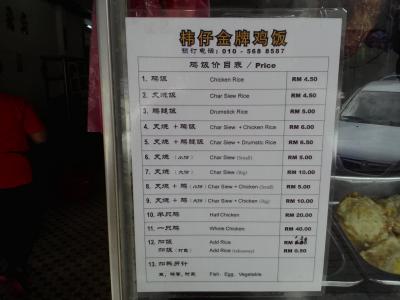 私も皆さんと同じくチキンライスともやし炒めをオーダー。チキンライスはライスと別盛りか一緒盛りか選べます。もちろんチキンの量、値段も違います。1人だったので一緒盛り(6RM)に。もやし炒めは1皿4RMですが量がわからなかったので1人分でいいといったら3RMでした。計9RM。さてお味は…まぁ、うまいです。ですが見たまんまのうまさです。驚くほどではないです。コスパ的にはいまいちかなと。ビールは大ビンでタイガー、カールスバーグが17RM、ギネスが21RMです。- 旅行時期