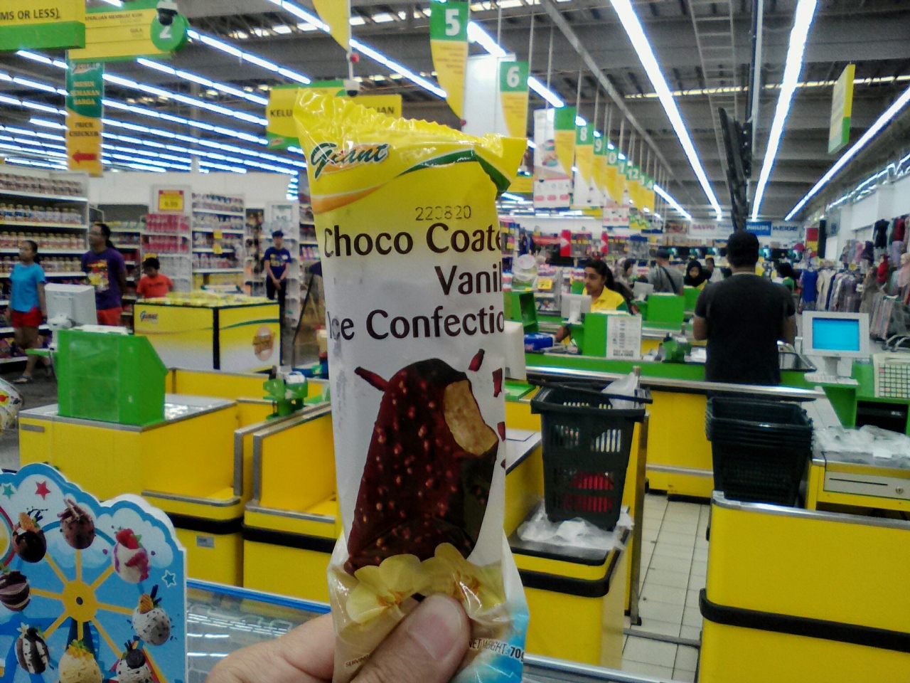 内部はローカル感全開です。やや暗めの照明やコンクリートの床、倉庫風な商品の陳列棚など若干のディープさも感じられるほど。フードコートもいい味出してます。giantを訪れたら(どの店舗でもOK)ぜひ試してほしいものがあります。それはgiantブランドのアイスクリーム。いくつか種類がありますがおすすめはチョコクランチのバニラアイスバー(写真参照)。お値段なんと1.27RM。安い!もちろんうまい!オリジナルブランドならではの価格、マレーシアの物価からしたらかなりお得だと思います。節約派の旅行者でも気兼ねなく食べられます。ほんとおすすめです。