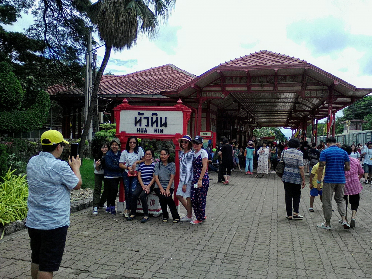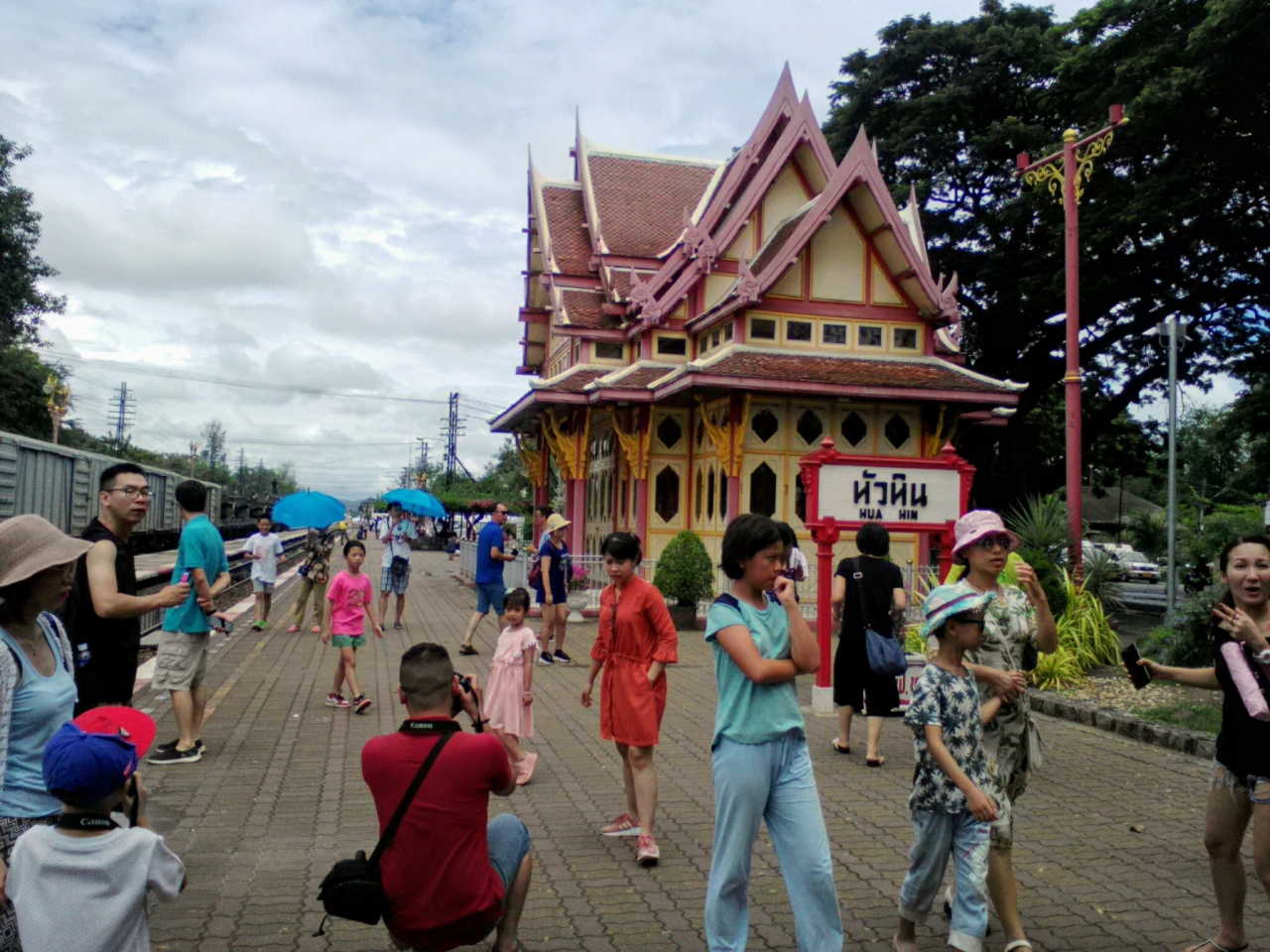 列車の到着時刻前に行くとすごいです。観光客による大撮影大会。特に中国人旅行者が多いです。駅名の看板の前、王室待合室前、ホーム、線路の上など。ホアヒン駅は“絵になる”造りなのでその気持ちはよくわかります。ポーズを付けて撮影しているのはなかなかおもしろい光景です。これもホアヒン名物の一つだと思います。