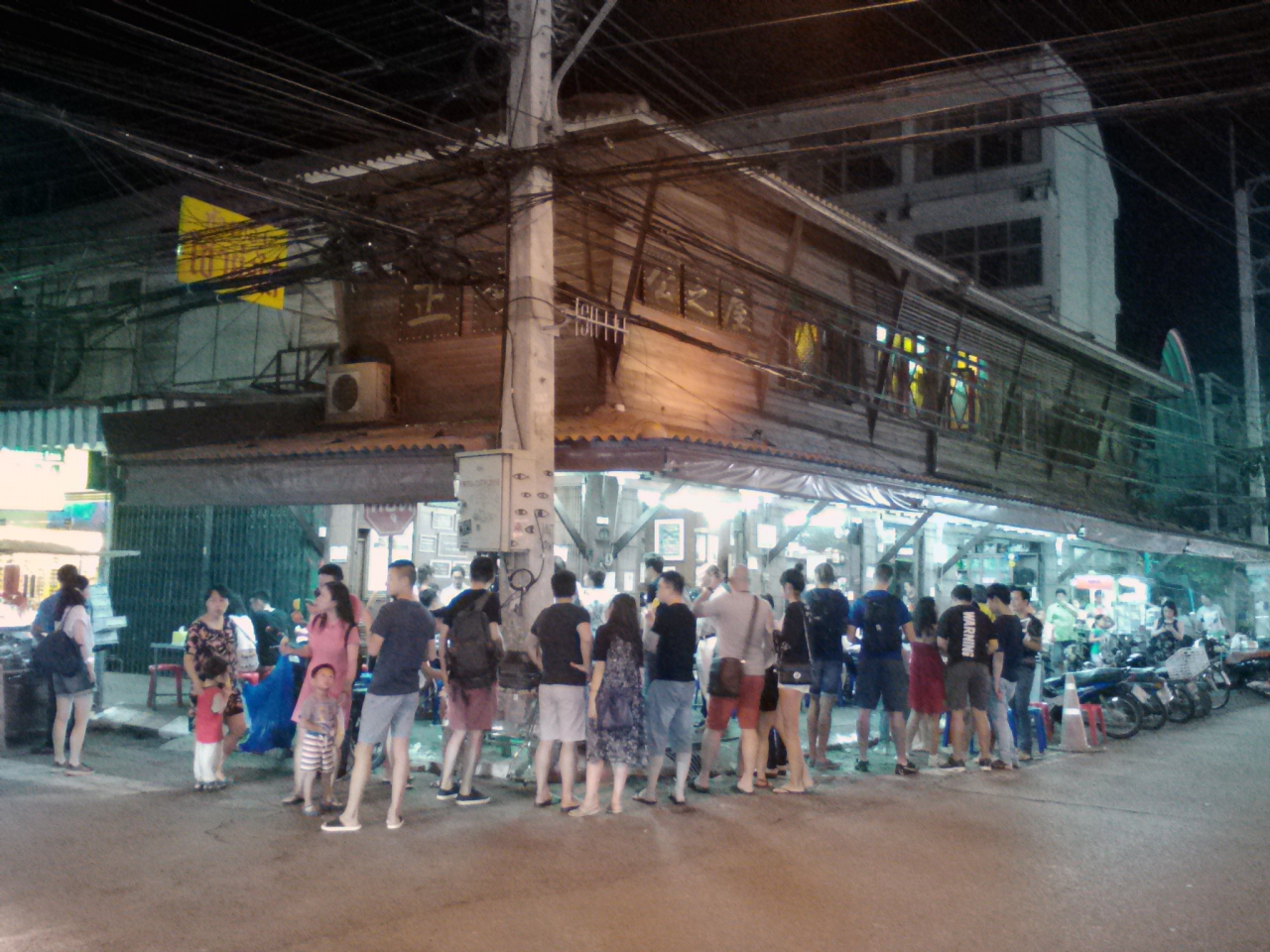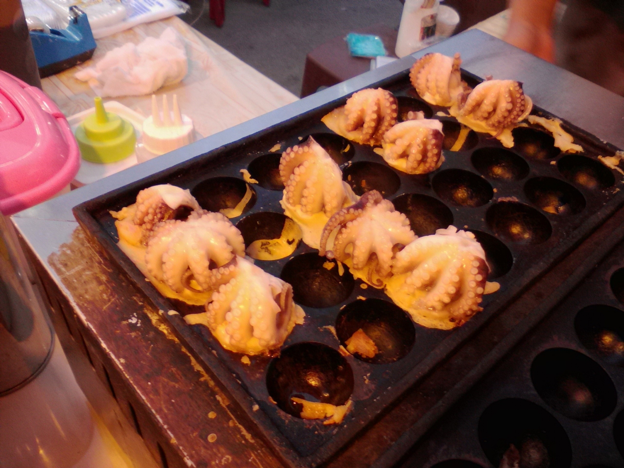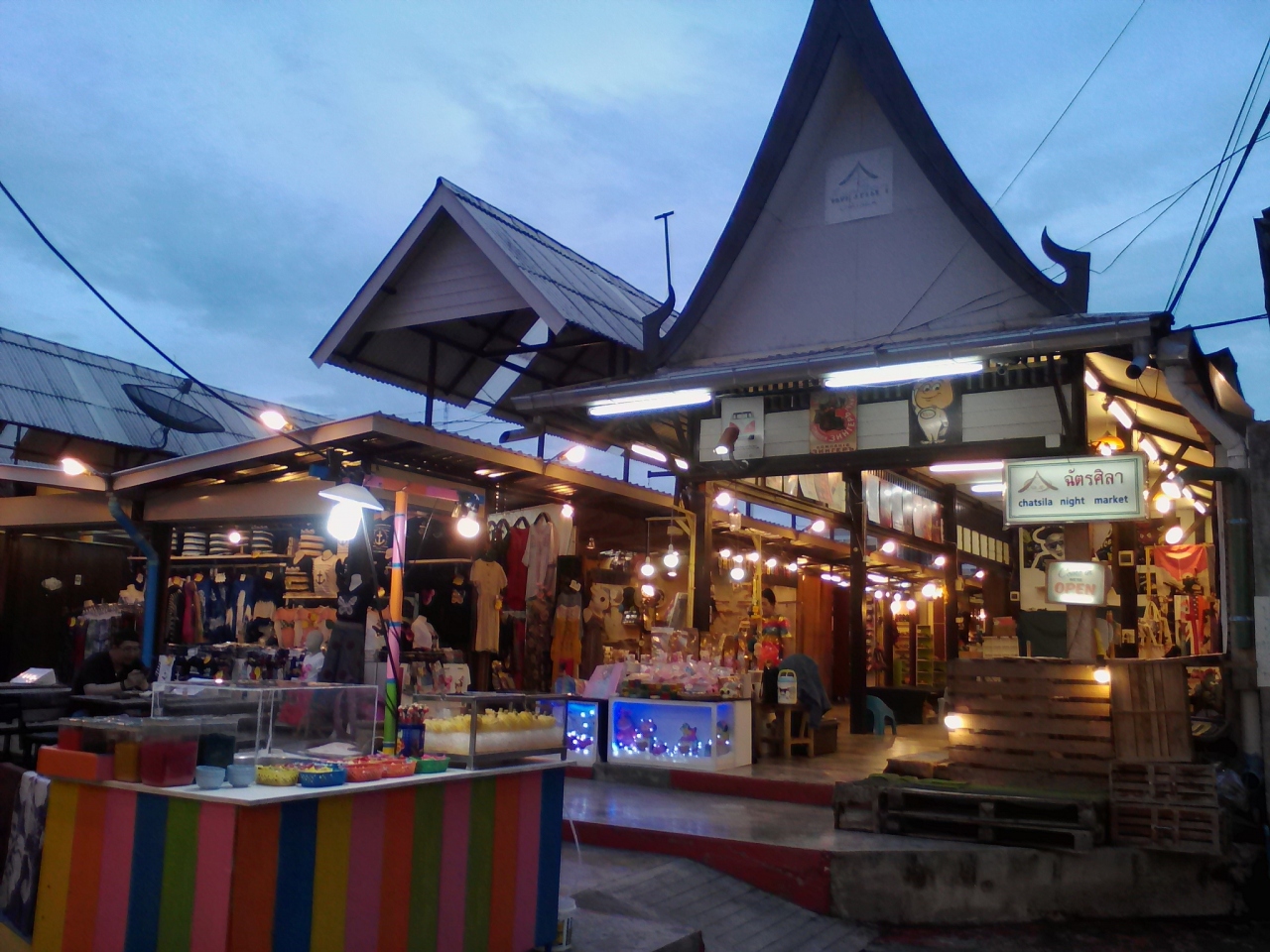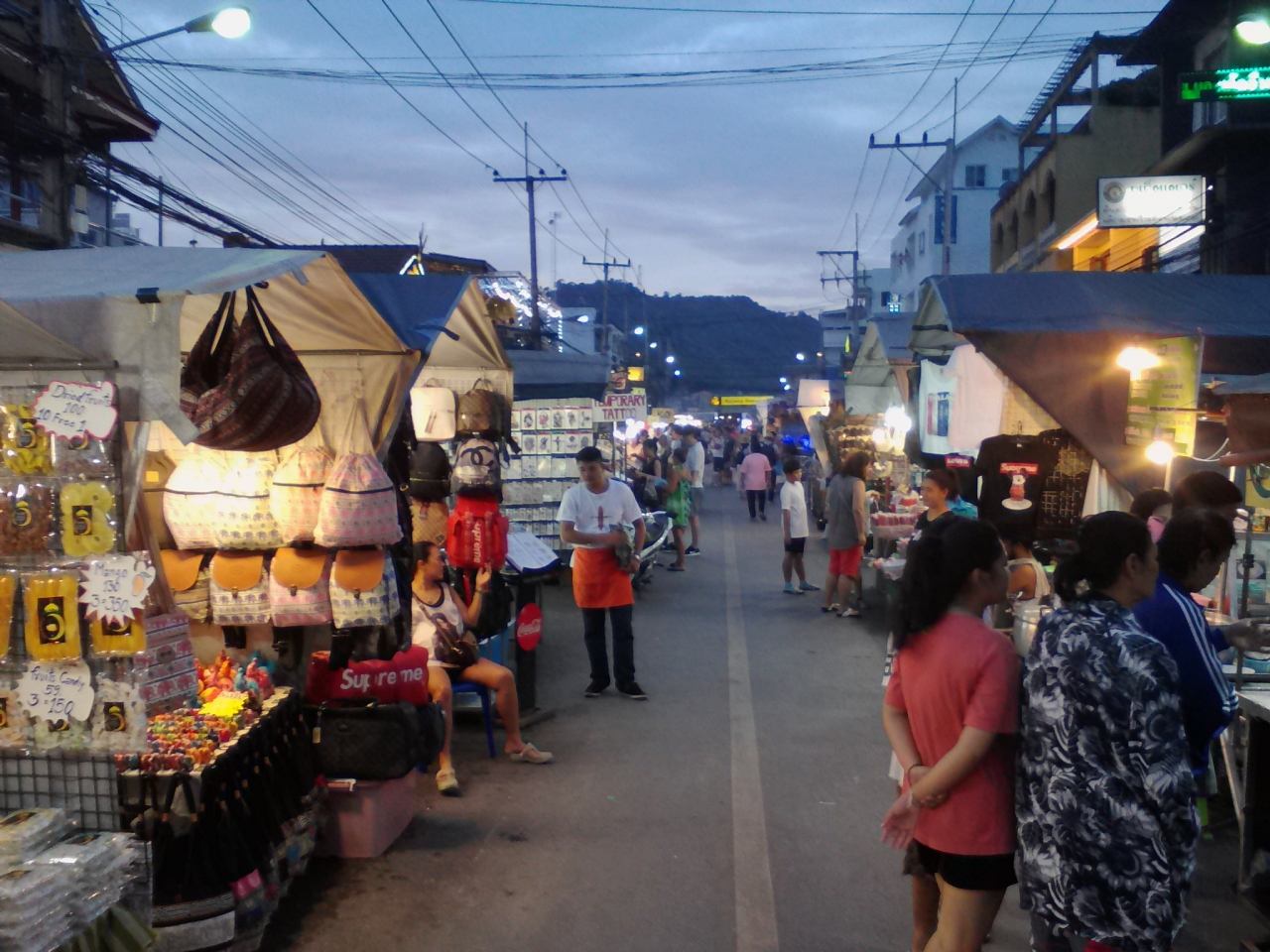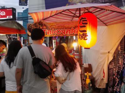 観光客向けのマーケットです。Tシャツやタイパンツ、雑貨類の土産物屋や1本10Bの焼き鳥から何千Bもするロブスターまで食べられる屋台がずらりと並んでいます。人出も多くお祭りの縁日のようで楽しめると思います。最近タイでは“なんちゃって寿司”屋台を多く見かけますがたこ焼き屋台もちらほら…。普通はタコなど入っていないこれまたなんちゃって系が多いのですがここのナイトマーケットのはすごかった…。なんとタコに覆われたたこ焼き(すでにたこ焼きという食べ物ではなくなっていますが…)。この発想は日本人にはないと思います。4個で80B。日本で儲けるなら今のうちがチャンスだと思います。