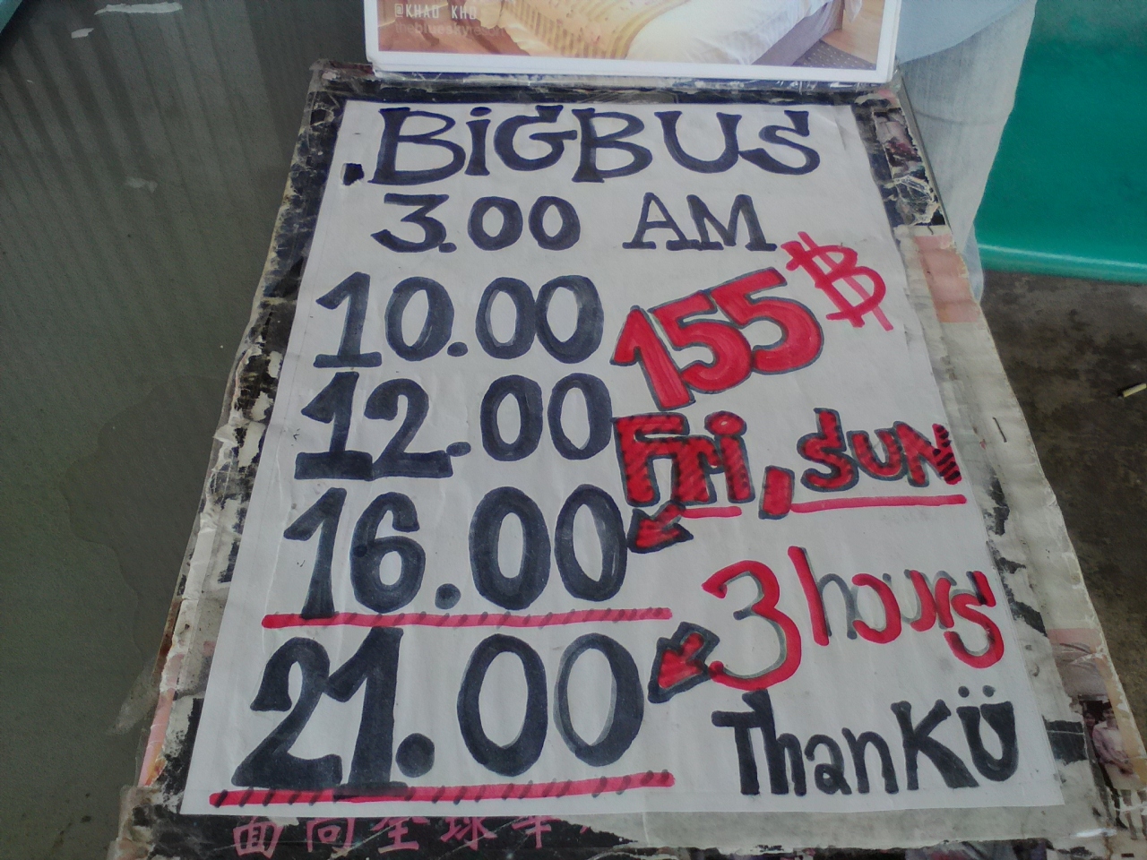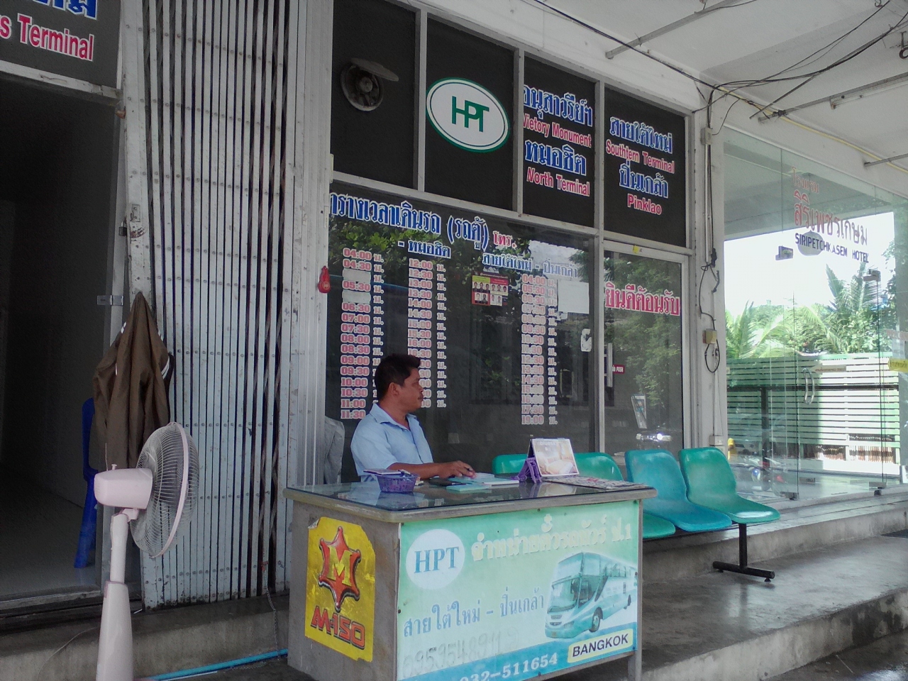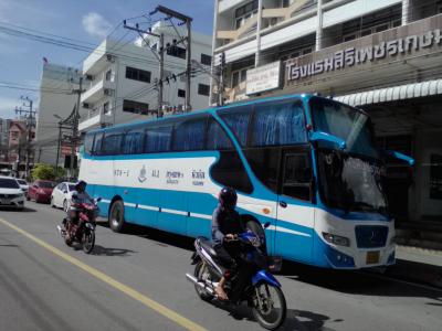 町外れにバスターミナルらしきものはあるようですがバンコクに行くならわざわざバスターミナルまで行く必要はありません。町中にあるバス会社のオフィスでチケットが買え、オフィス前から乗車できます。例えばナイトマーケット中心の交差点からSA SONG通りを南に100mほど行った「Hua hin Pran Tour(HPT) 」ではバンコクの南バスターミナルへ毎日3:00、10:00、12:00と金曜,土曜はさらに16:00、21:00のバスが出ています。料金155B、所要約3h。