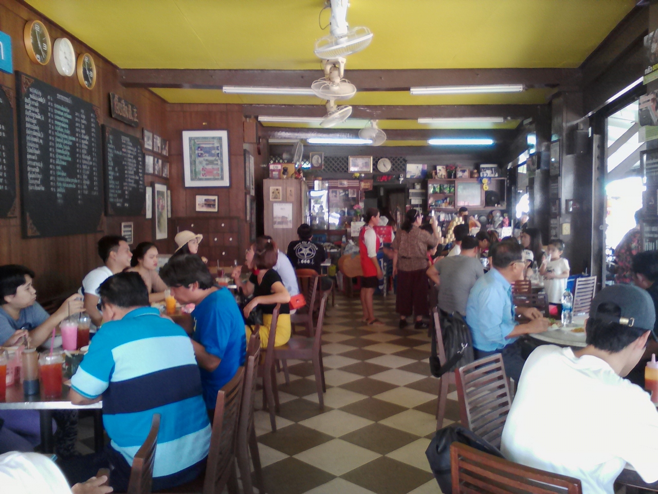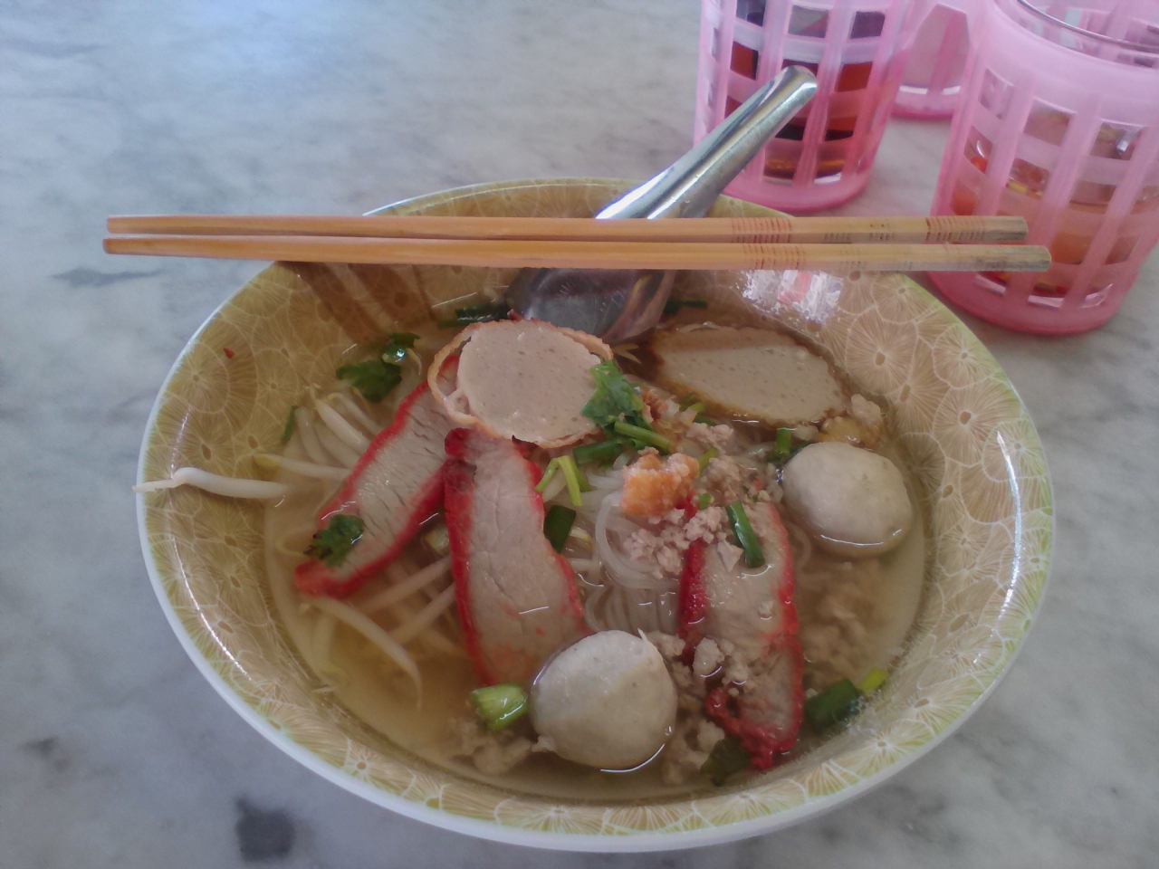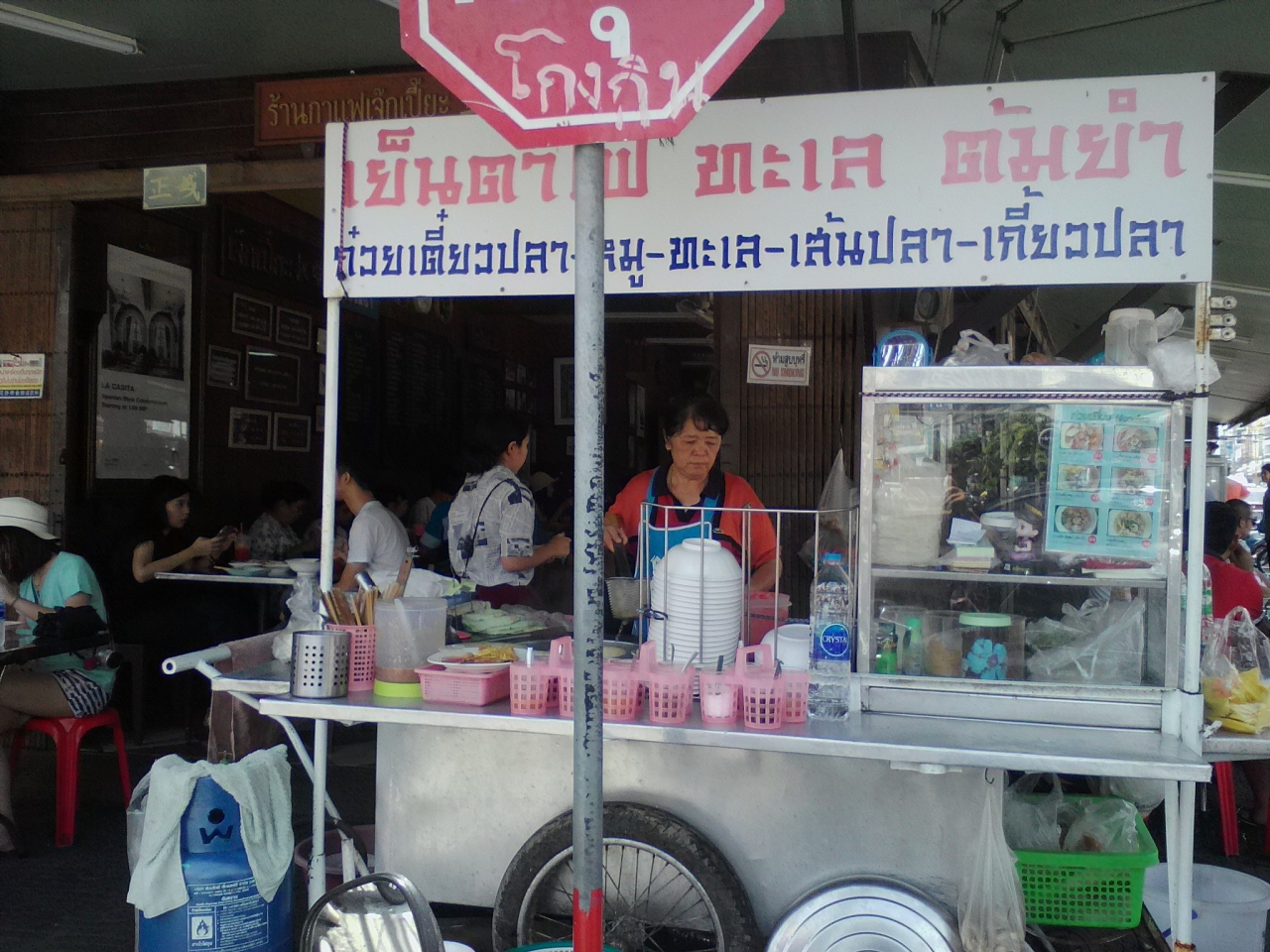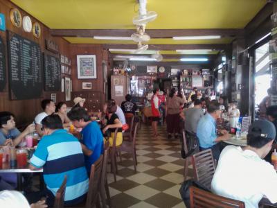 夜に行くとほとんどの人が鍋食べてます。大繁盛で店の外には順番待ちの大行列。確実にお一人様で行くような店ではありません。というわけで、あるガイドブックに朝昼は麺類をやっていると書いてあったので昼めしを食べに行ってみました。しかし先日12:30頃行ったらちょうど売れ切れだったので今回は11:00に行きリベンジ。店の前には麺の屋台が出ていましたが他にもカオムーデンやサテなどの屋台も出ており客は色々な物を食べていました。一応注文は店の人が取りに来ますが一種のフードコートのよう。昼間の経営もこのソンムージョームなのでしょうか。疑問は解消しないまま麺、クイッティアオ・ムー・ナムを食べましたが上品なお味、上品な盛り付けでおいしかったです。これで30Bなら満足です。けど昼間にわざわざ行く必要があるかな。やはり夜に鍋を食べに行った方がいいと思います。