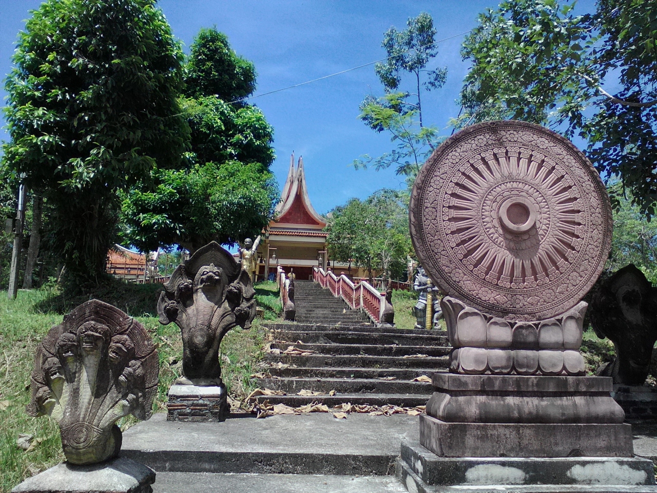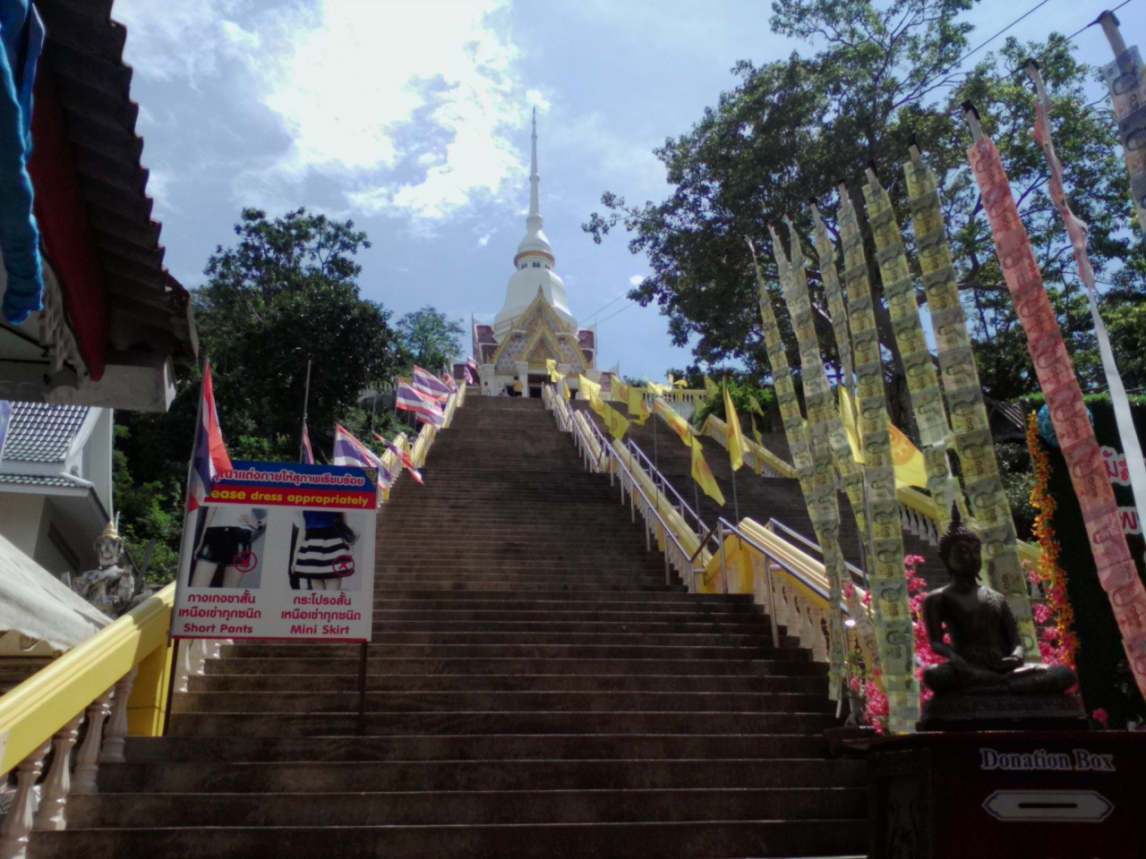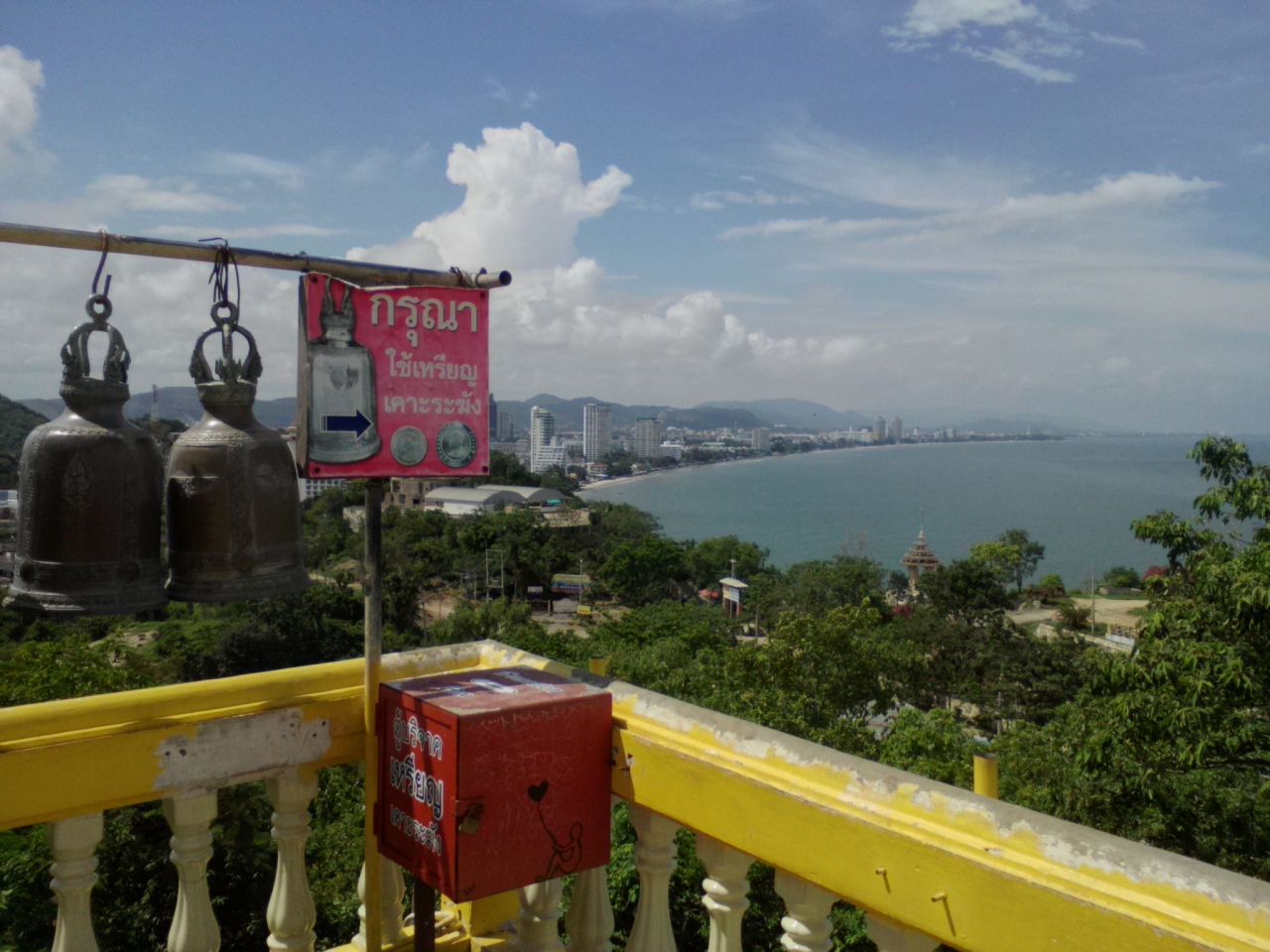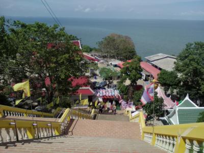 天気のいい日に行って下さい。それとビーチ側から登った方が眺めがいいです。白い砂浜に高層ホテルが立つさまはなかなかのもんです。一番奥にあるお寺は普通でイマイチ。タイ人はご利益を願い熱心にお参りしてますが、私には特別感ずるものはありませんから…。カオタキアップだけ行くなら乗り合いソンテウが便利です。ナイトマーケットの交差点に待機している緑色のソンテウです。カオタキアップは終点、10Bです。