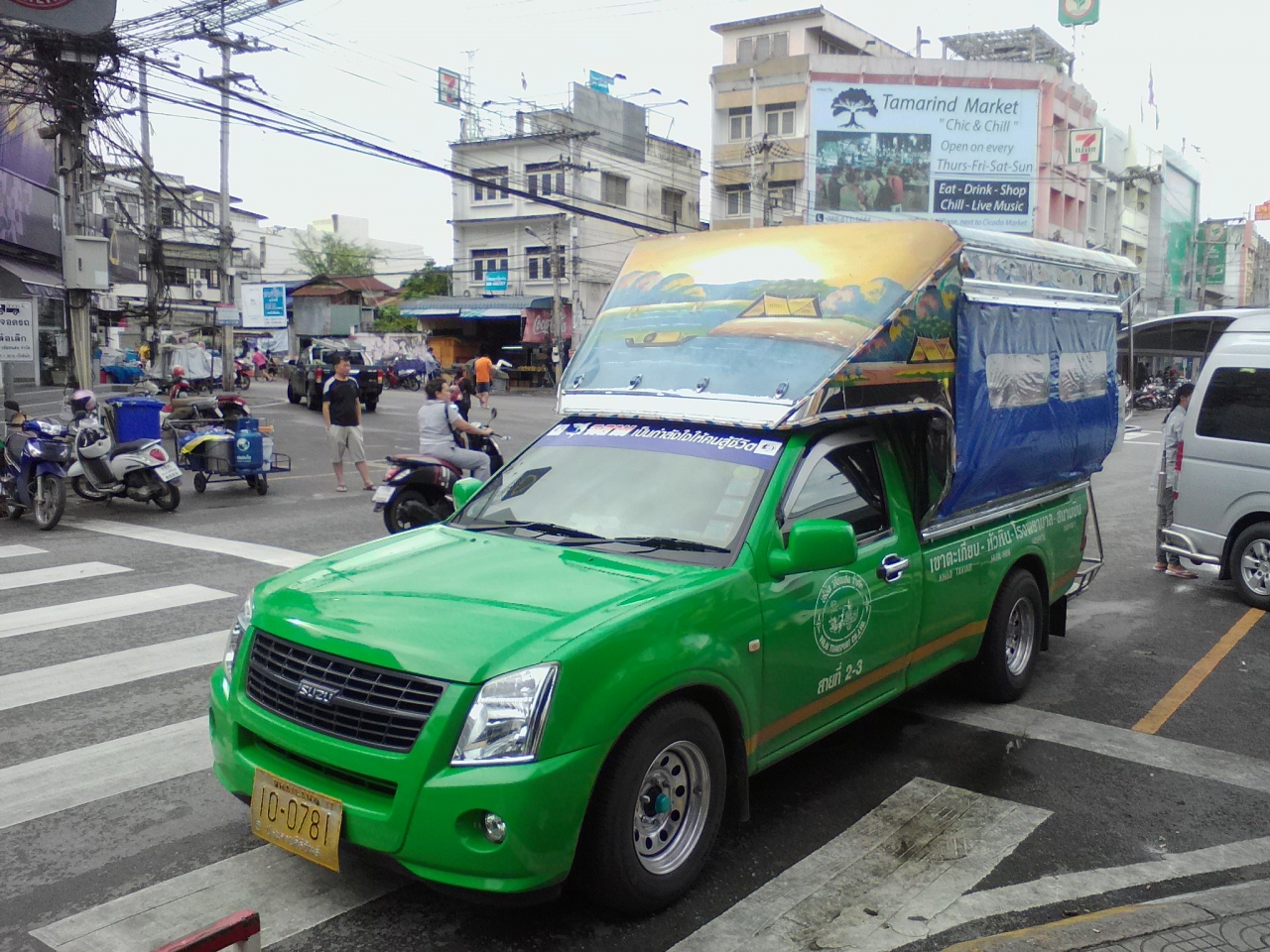 ホアヒンの町を移動するなら緑色の乗り合いソンテウが便利です。起点はナイトマーケットの交差点。常に何台かが待機しています。北は空港、南はカオタキアップまで。その間にあるプルーンワン、グランドナイトマーケット、マーケットビレッジ、CICADAマーケットなどの観光スポットも通ります。基本どこでも乗り降り自由。合図をするか車内のベルを鳴らせば停まってくれます。一乗り10Bですが夜間は15Bになるようです。