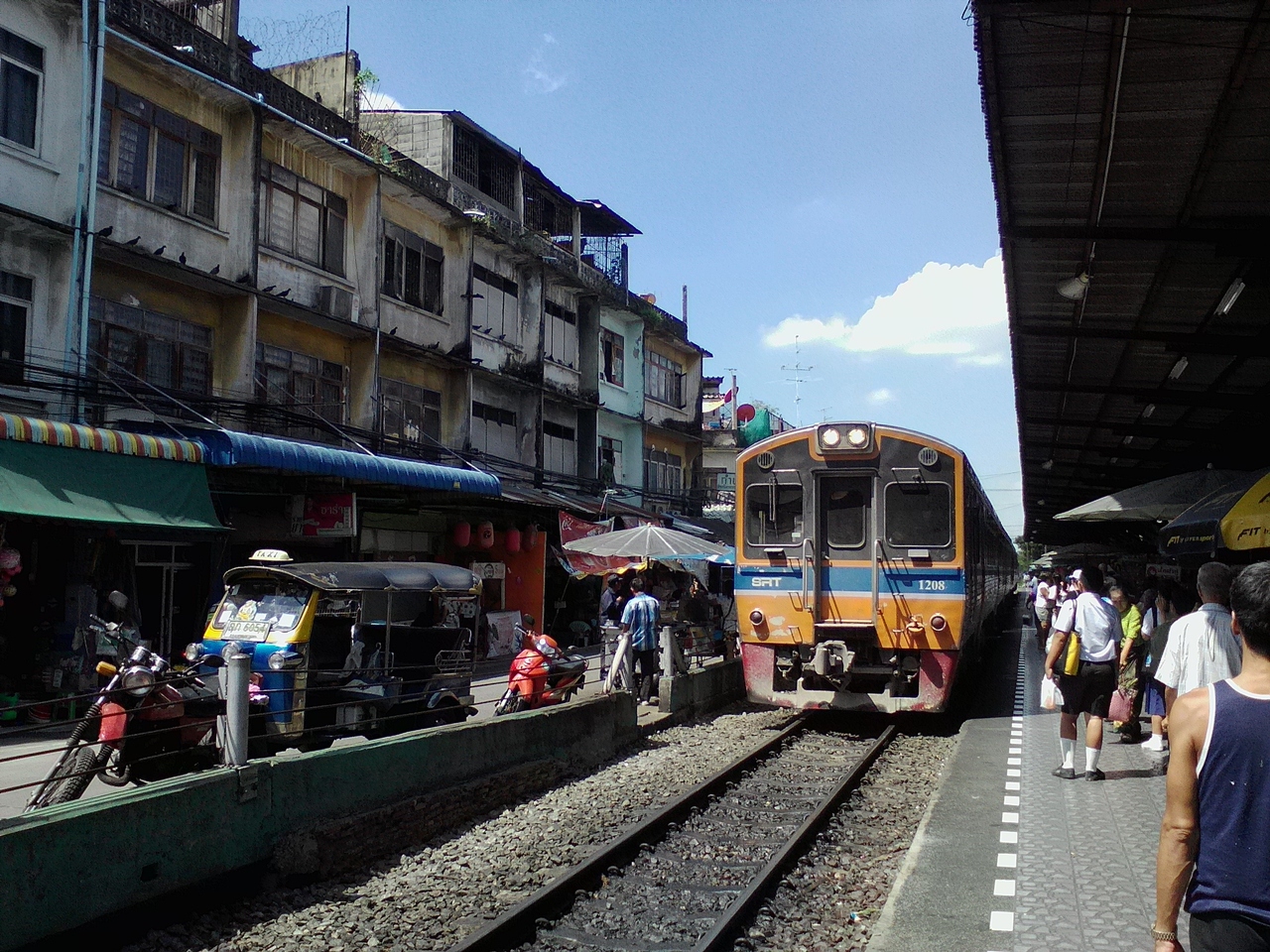 バンコク、ウォンウェンヤイ駅からローカル線であるマハチャイ線に乗ってみました。マハチャイ線の後にメークロン線に乗り継げば線路市場で有名なメークロン駅に行くことのできる旅行者の間ではなかなか知られた線です。で、私の乗車区間はタラートプルーまでの一駅。これにも一応理由があります。ワットパークナムに行くためで最寄りの駅がタラートプルーだったからです。ワットパークナムに行くならわざわざウォンウェンヤイ駅まで行き列車に乗るようなことはせず、タクシーやトゥクトゥクで行った方が手っ取り早いですがまあいいじゃないですか。これが旅ってもんです。乗車時間わずか4分、料金3Bの列車旅でした。もちろんローカル線の旅情を味わうヒマなんてありませんでしたが…。