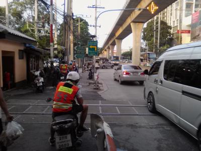 42番のバスはピンクラオ橋を渡り2つ目の大きな交差点を左折し、Charan Sanitwong Rdを進みます。駅最寄りのバス停は運河を渡った次のバス停(Soi 32を過ぎた直後、現在建設中のBTSの駅の真下)。このバス停は線路を横切る50mほど手前にあります。線路を横切った後のバス停はやや遠くなります。そして線路まで歩き、左折、500mほどまっすぐ行けばトンブリー駅です。歩きたくない人は左折する角に待機しているバイタクを使えば10Bです。左折した後には巨大朝市が開いており朝ご飯なども買えます。