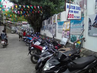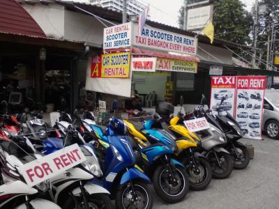 レンタルバイク屋が多いのは駅前から続く通りの国道4号線との交差点からビーチにかけて。ヒルトンホテルの北側の中国寺院へと続く通りにも少しあります。バイクの排気量にもよりますが一般的なスクーターなら相場は1日(24h)200B~。ただし店によっては国際運転免許証を持っていなければ貸してくれないところもあります。パスポートのみでOKというところもありますが、要するに何かあって警察に関わると国際運転免許証の提示を求められる場合があるようです。持っていなければ罰金かワイロかわかりませんが何百バーツを払わなければいけないということ。警察に関わらなければ問題なしです。自己責任ということのようです。