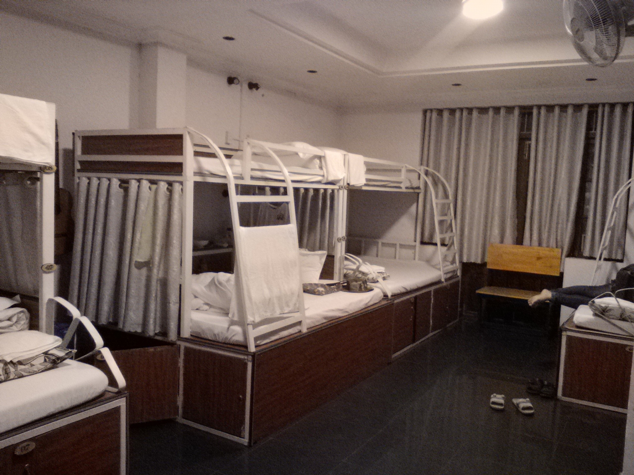 Booking.comで予約、立地と料金を加味して選びました。ドミ4$。ホットシャワー、FANでしたが涼しかったので必要ありませんでした。室内には2段ベットが4台ありますがこのベットが変わっていて下段が大きく上段が小さいもの。好みにもよりますがやはり広い下段の方が過ごしやすいと思います。料金は同じだし…。予約で希望を伝えてもどれだけ考慮してくれるかは疑問です。おそらく先着なので運によると思います。朝食付きで1階のレストランでいただけます。基本は卵料理と飲み物とバケット、メニューの中から選べます。インスタントラーメンもあります。スタッフは英語堪能でちゃんとしていてとても助かります。バスの予約(チケット販売ではない)もサービスでしてくれました。