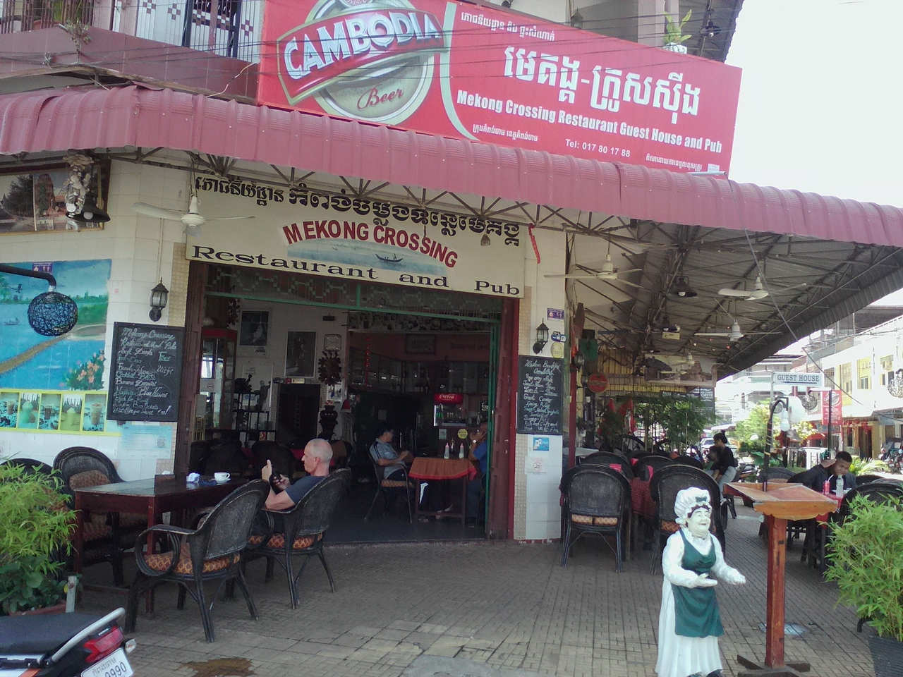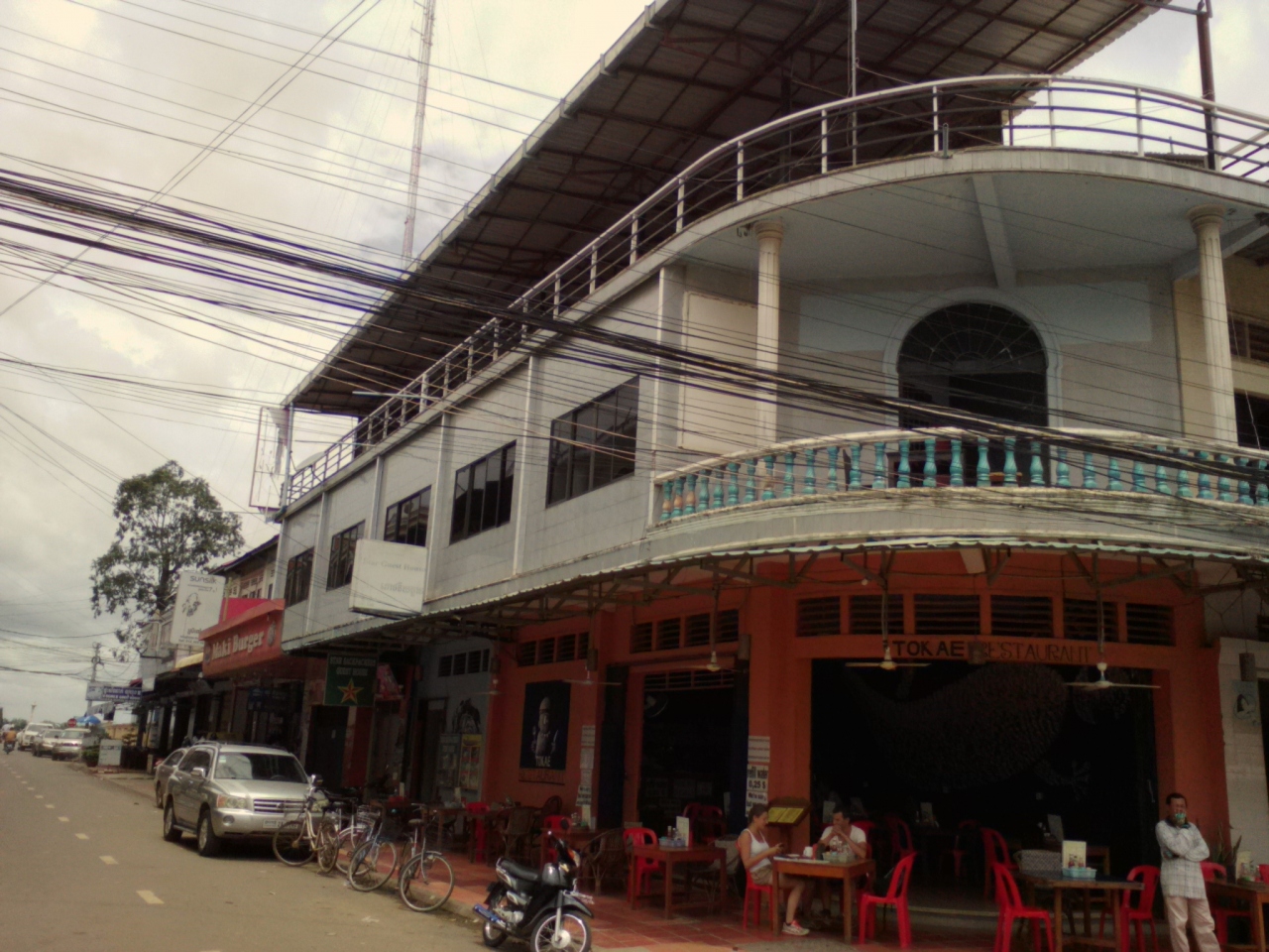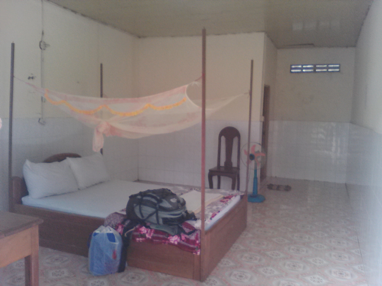 Booking.comでドミを予約。1泊3$でしたが4泊にしたら1泊あたり2.5$になりました。クラチエでは最安のG.Hだと思います。西洋人がオーナーでだいたい1階のレストランにいます。部屋は広く、ベット(マットレスのみ)が6個。シンプルですが感じはいいです。各ベットにはファン、コンセント、ライト、イス、蚊帳、セーフティボックスがあり、一応ちゃんとしています。市場まで10m、メコン川まで50mという便利な立地ですがドミのバルコニーが市場に面しているので人の喧騒やらバイク、車の音がうるさいです。