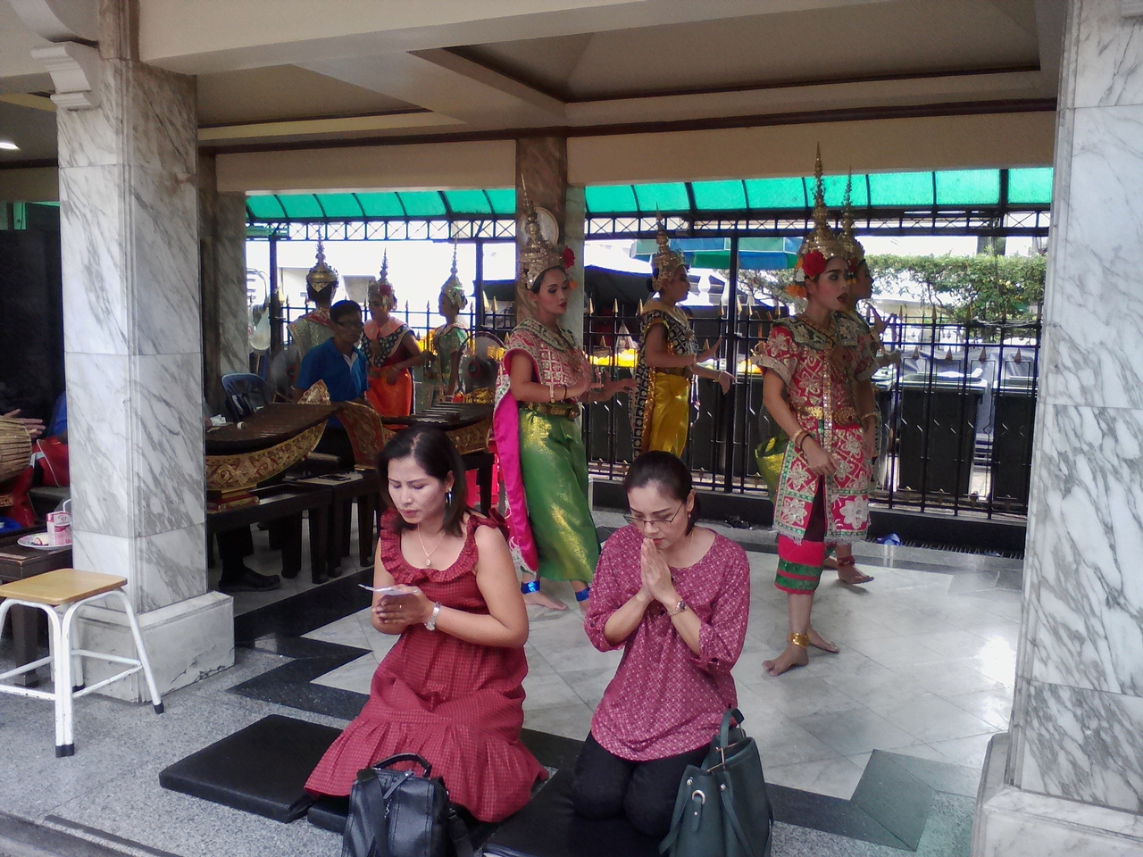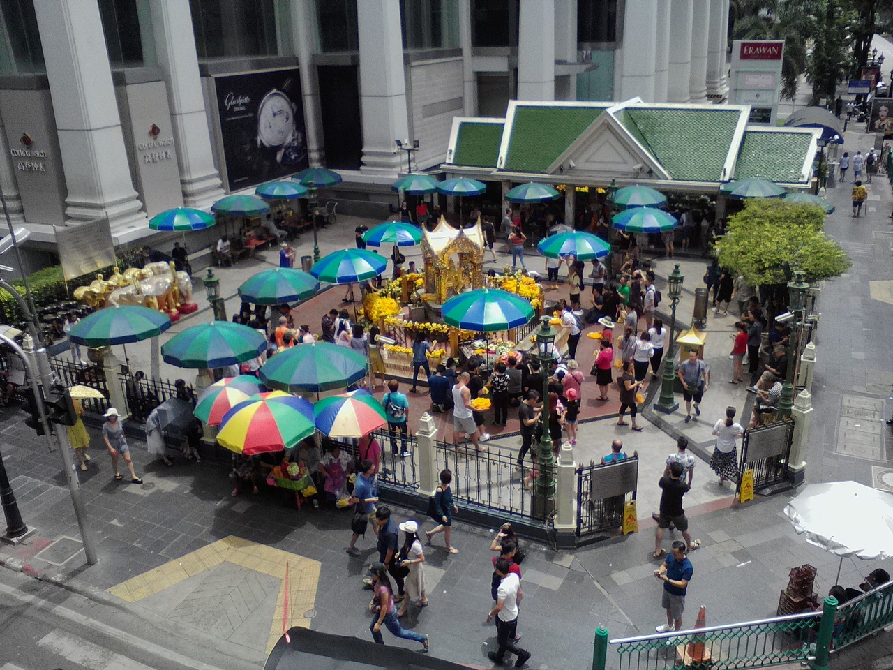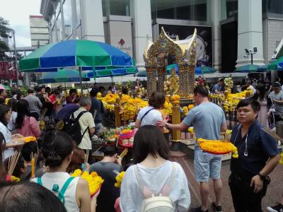 ヒンドゥー教ブラフマーを祀った祠があり、タイで最もご利益があるとされているため1日中参拝者で混んでいます。祠の一角では願い事が成就した人々のための奉納舞踏が行われています。30秒ほどの踊りですがお値段なんと710B(フルメンバー8人による踊り)。もちろん周りで見るだけなら無料ですので訪れた方は必見です。