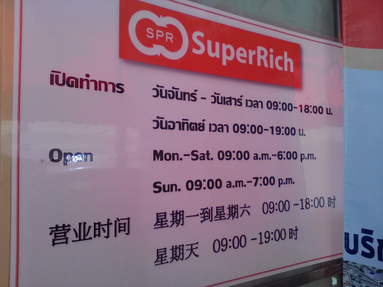伊勢丹向かいの緑とオレンジが向かい合っているところ(Ratchadamri Soi 1)に行ったらなんと両店とも休み。で、今日は日曜日だということに気づく…。安心して下さい。日曜日でも隣りのSoi 2にあるオレンジは開いています。本当は緑とオレンジを比べレートのいい方で両替したかったのですが仕方ありません。オレンジでUS$を両替しました。この日のレートは1$=32.25B、1円=0.2895Bでした。ちなみに同じ日のカオサン通りで一番レートのよかった「RAINBOW EXCHANGE」(バーガーキング側入口すぐ右側)では1$=32.20B、1円=0.2885Bと結構善戦。カオサンに泊まっている方ならわざわざ100$、1万円ぽっちをバスを使って(普通バス往復13B)両替しに行くと赤字になります。そのおつもりで…。