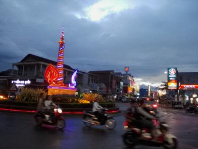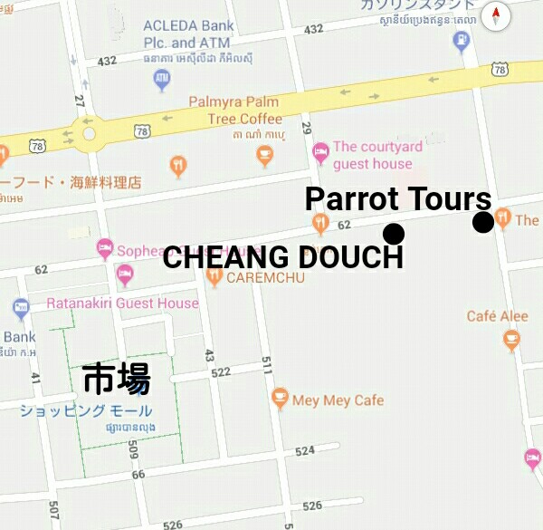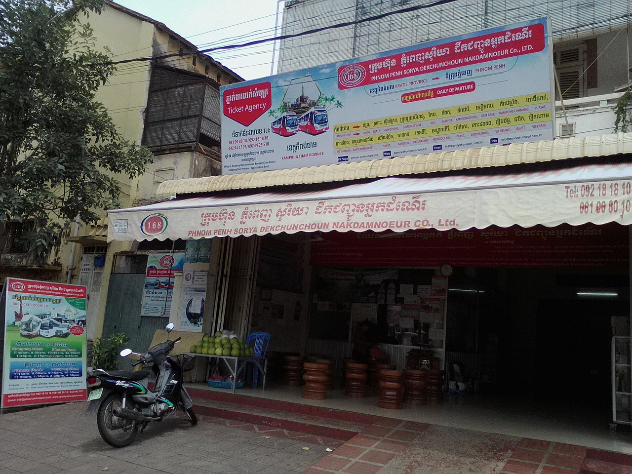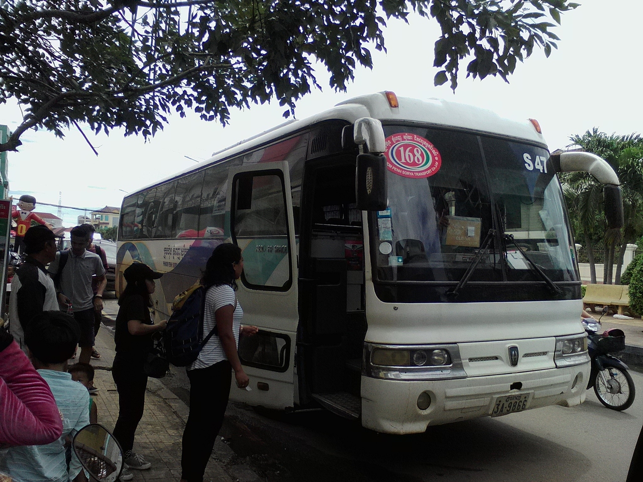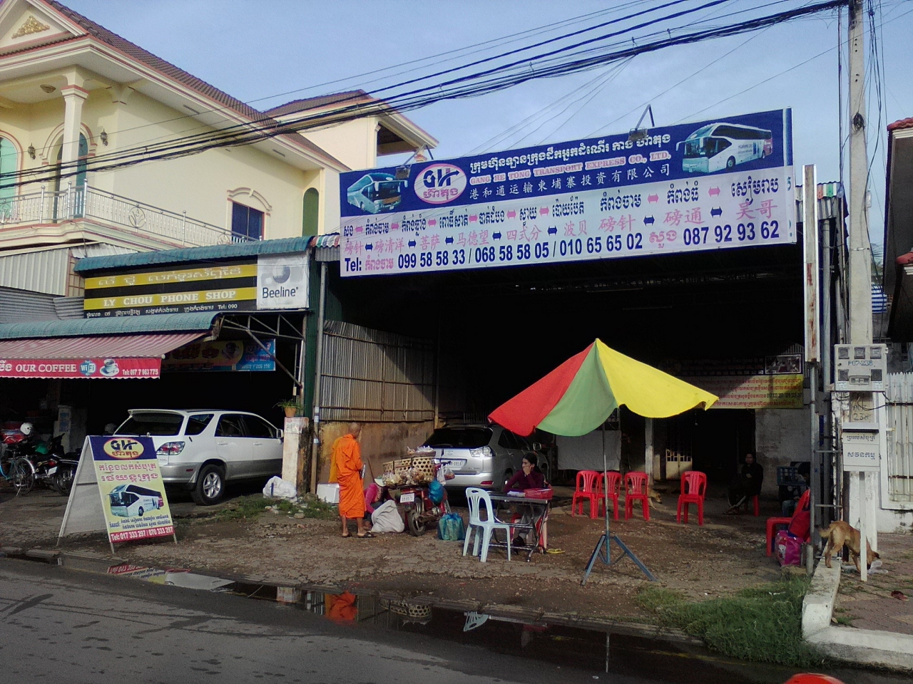 コンポンチャムからの長距離バスはナーガ像のあるロータリーからモニボン通り沿いにかけてあるバス会社のオフィスから乗るのが一般的です。バス会社によって料金は異なります。バッタンバンへは7ドルのところが多かったですが(ソリヤは8ドル)、6ドルのところがありました。「GUI WANDA TRANSPORT EXPRESS CO.,LTD」。会社のロゴマークは「GW」ですが「GH」に見えるので注意して下さい。場所は有名な大型レストラン「ハオアン」の向かいです。出発時刻は朝8:00(1日1本)、バッタンバンへは15:45に到着しました。