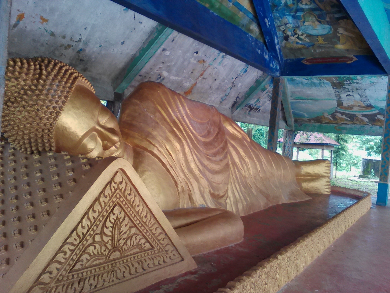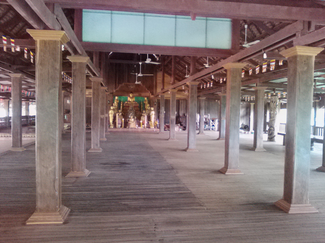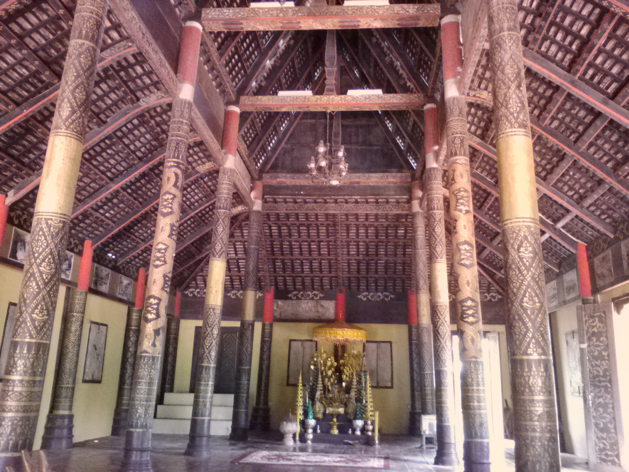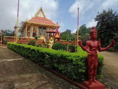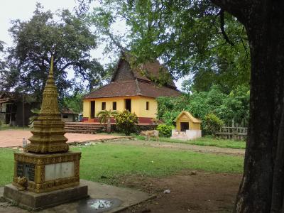 クラチエ市場から南に約2km。舗装された道路を行くと左手に見える金色の門の奥にあるのが新しい寺院。こちらはいたって普通です。見どころとなっている古い寺院は道路を挟んだ右手にあります(メコン側)。約200年前に建てられたものですが外壁のペンキが塗り替えられてしまっていて趣きは半減。しかし屋根に残るブッダの透かし彫りと内部は当時のまま残されています。この日は扉が開いていたので内部を見ることができました。なんとも雰囲気のある木造の造りで細部を見入ってしまうほど。柱に描かれているナーガも必見です。見学無料。メコン川沿いの小道からも行けるので散歩がてらにちょうどいいと思います。