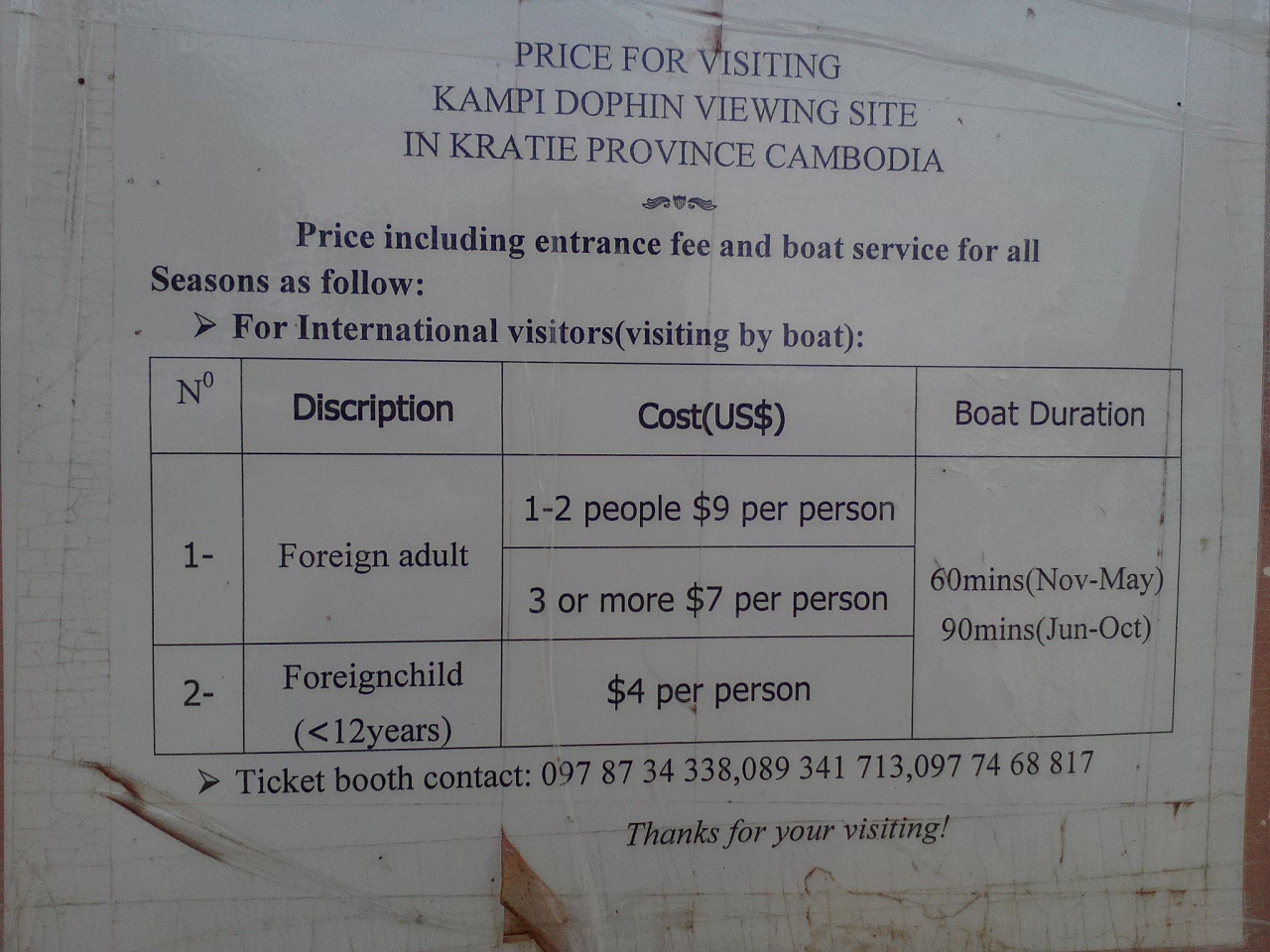 クラチエの北15kmのカンピ村からボートに乗るのが一般的です。ボート乗り場にはちゃんとチケットオフィスがあり料金が決められています。ボート1艘1~2名なら1人9ドル、3名以上なら1人7ドルです。子供(12歳より下)は一律4ドル。ちなみにこれは外国人料金です。カンピ村までの交通費ですが町中にいるトゥクトゥクは往復10ドル、バイタクは5ドルです(いづれも最初の言い値です)。トゥクトゥクは3人は乗れるのでシェアすればお得です。メコン川沿いを歩いていれば声をかけられます。また自転車やバイクを借りて自力で行くこともできます。ちなみに「Star Backpackers G.H」では自転車1ドル~、バイクは6ドル~で借りられます。