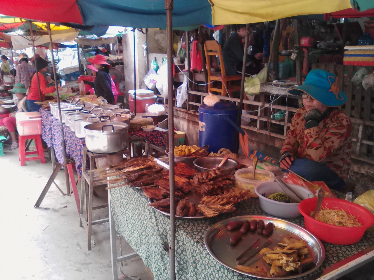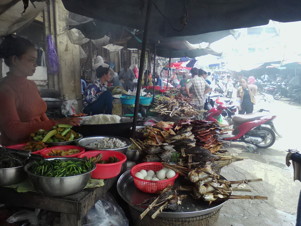 市場内にも軽食屋があります。ここで焼きうどんを食べましたが3000Rの割りには量も少なく、かなりいまいち。これならメコン川沿いの屋台で2000Rで食べられます。